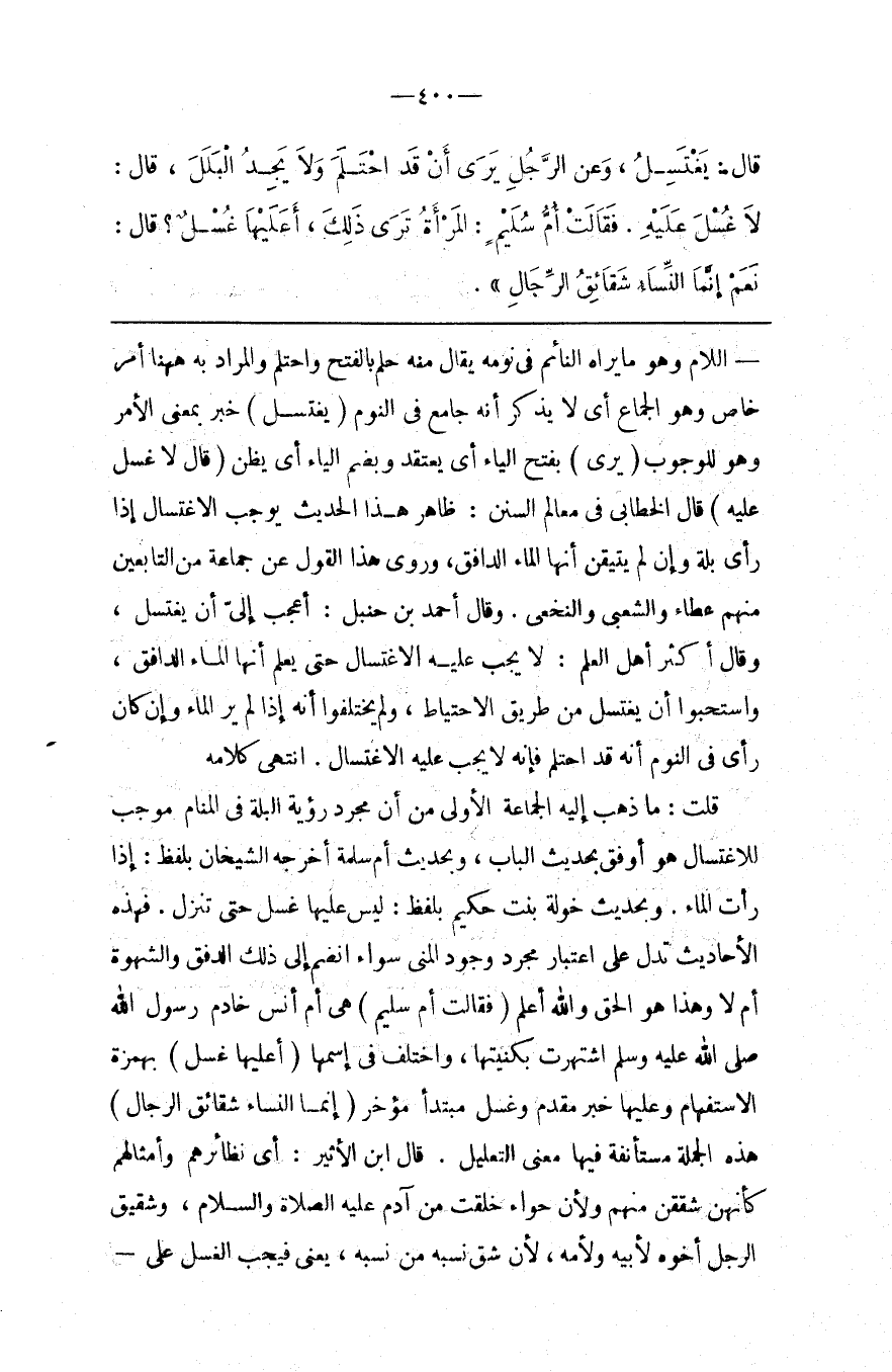 قُلْت : مَا ذَهَبَ إِلَيْهِ الْجَمَاعَة الْأُولَى مِنْ أَنَّ مُجَرَّد رُؤْيَة الْبِلَّة فِي الْمَنَام مُوجِب لِلِاغْتِسَالِ هُوَ أَوْفَق بِحَدِيثِ الْبَاب ، وَبِحَدِيثِ أُمّ سَلَمَة أَخْرَجَهُ الشَّيْخَانِ بِلَفْظِ : إِذَا رَأَتْ الْمَاء . وَبِحَدِيثِ خَوْلَة بِنْت حَكِيم بِلَفْظِ : لَيْسَ عَلَيْهَا غُسْل حَتَّى تُنْزِل . فَهَذِهِ الْأَحَادِيث تَدُلّ عَلَى اِعْتِبَار مُجَرَّد وُجُود الْمَنِيّ سَوَاء اِنْضَمَّ إِلَى ذَلِكَ الدَّفْق وَالشَّهْوَة أَمْ لَا وَهَذَا هُوَ الْحَقّ وَاَللَّه أَعْلَم