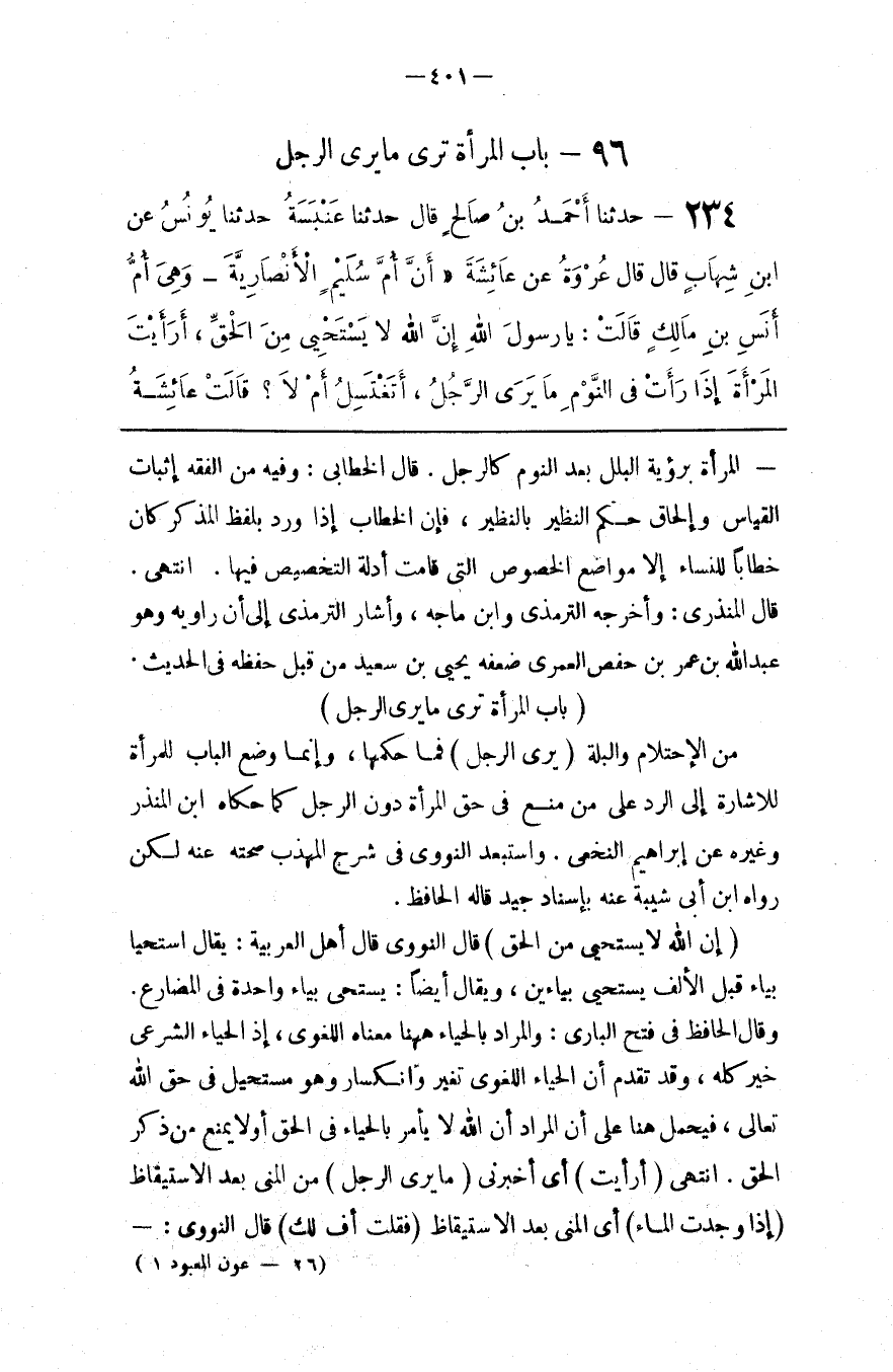 الْمَرْأَة بِرُؤْيَةِ الْبَلَل بَعْد النَّوْم كَالرَّجُلِ . قَالَ الْخَطَّابِيُّ : وَفِيهِ مِنْ الْفِقْه إِثْبَات الْقِيَاس وَإِلْحَاق حُكْم النَّظِير بِالنَّظِيرِ ، فَإِنَّ الْخِطَاب إِذَا وَرَدَ بِلَفْظِ الْمُذَكَّر كَانَ خِطَابًا لِلنِّسَاءِ إِلَّا مَوَاضِع الْخُصُوص الَّتِي قَامَتْ أَدِلَّة التَّخْصِيص فِيهَا . اِنْتَهَى . قَالَ الْمُنْذِرِيُّ : وَأَخْرَجَهُ التِّرْمِذِيّ وَابْن مَاجَهْ ، وَأَشَارَ التِّرْمِذِيّ إِلَى أَنَّ رَاوِيه وَهُوَ عَبْد اللَّه بْن عُمَر بْن حَفْص الْعُمَرِيّ ضَعَّفَهُ يَحْيَى بْن سَعِيد مِنْ قِبَل حِفْظه فِي الْحَدِيث .