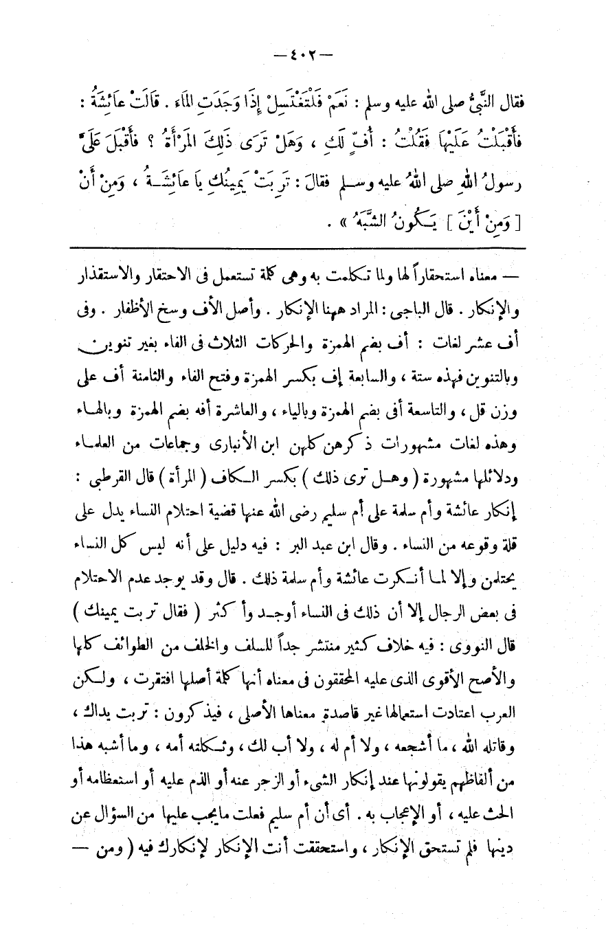 : قَالَ النَّوَوِيّ : فِيهِ خِلَاف كَثِير مُنْتَشِر جِدًّا لِلسَّلَفِ وَالْخَلَف مِنْ الطَّوَائِف كُلّهَا وَالْأَصَحّ الْأَقْوَى الَّذِي عَلَيْهِ الْمُحَقِّقُونَ فِي مَعْنَاهُ أَنَّهَا كَلِمَة أَصْلهَا اِفْتَقَرْت ، وَلَكِنْ الْعَرَب اِعْتَادَتْ اِسْتِعْمَالهَا غَيْر قَاصِدَة مَعْنَاهَا الْأَصْلِيّ ، فَيَذْكُرُونَ : تَرِبَتْ يَدَاك ، وَقَاتَلَهُ اللَّه مَا أَشْجَعه ، وَلَا أُمّ لَهُ ، وَلَا أَبَ لَك ، وَثَكِلَتْهُ أُمّه ، وَمَا أَشْبَهَ هَذَا مِنْ أَلْفَاظهمْ يَقُولُونَهَا عِنْد إِنْكَار الشَّيْء أَوْ الزَّجْر عَنْهُ أَوْ الذَّمّ عَلَيْهِ أَوْ اِسْتِعْظَامه أَوْ الْحَثّ عَلَيْهِ ، أَوْ الْإِعْجَاب بِهِ . أَيْ إِنَّ أُمّ سُلَيْمٍ فَعَلَتْ مَا يَجِب عَلَيْهَا مِنْ السُّؤَال عَنْ دِينهَا فَلَمْ تَسْتَحِقّ الْإِنْكَار ، وَاسْتَحْقَقْت أَنْتِ الْإِنْكَار لِإِنْكَارِك فِيهِ