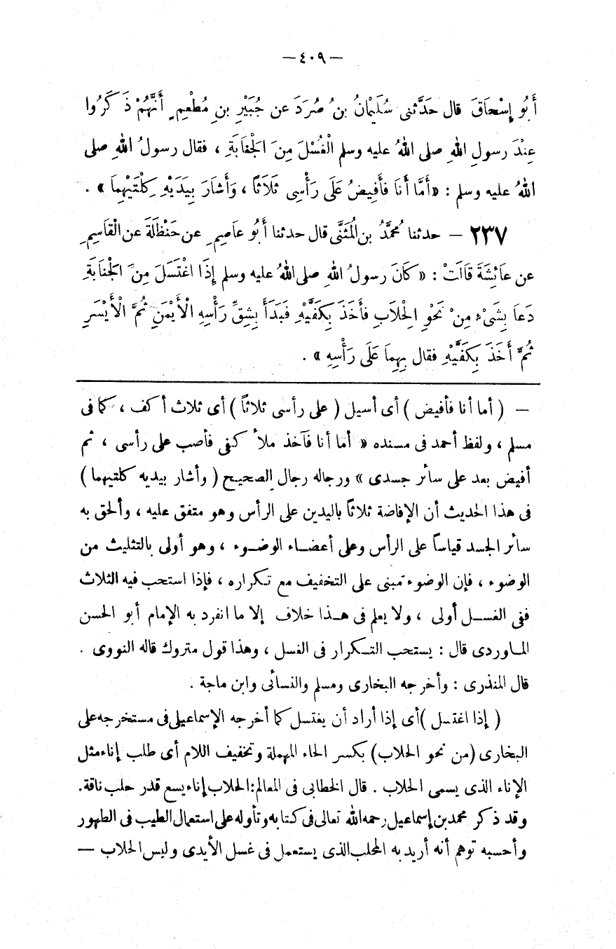 : فِي هَذَا الْحَدِيث أَنَّ الْإِفَاضَة ثَلَاثًا بِالْيَدَيْنِ عَلَى الرَّأْس وَهُوَ مُتَّفَق عَلَيْهِ ، وَأَلْحَقَ بِهِ سَائِر الْجَسَد قِيَاسًا عَلَى الرَّأْس وَعَلَى أَعْضَاء الْوُضُوء ، وَهُوَ أَوْلَى بِالتَّثْلِيثِ مِنْ الْوُضُوء ، فَإِنَّ الْوُضُوء مَبْنِيّ عَلَى التَّخْفِيف مَعَ تَكْرَاره ، فَإِذَا اُسْتُحِبَّ فِيهِ الثَّلَاث فَفِي الْغُسْل أَوْلَى ، وَلَا يُعْلَم فِي هَذَا خِلَاف إِلَّا مَا اِنْفَرَدَ بِهِ الْإِمَام أَبُو الْحَسَن الْمَاوَرْدِيُّ قَالَ : يُسْتَحَبّ التَّكْرَار فِي الْغُسْل ، وَهَذَا قَوْل مَتْرُوك قَالَهُ النَّوَوِيّ . قَالَ الْمُنْذِرِيُّ : وَأَخْرَجَهُ الْبُخَارِيّ وَمُسْلِم وَالنَّسَائِيُّ وَابْن مَاجَهْ .