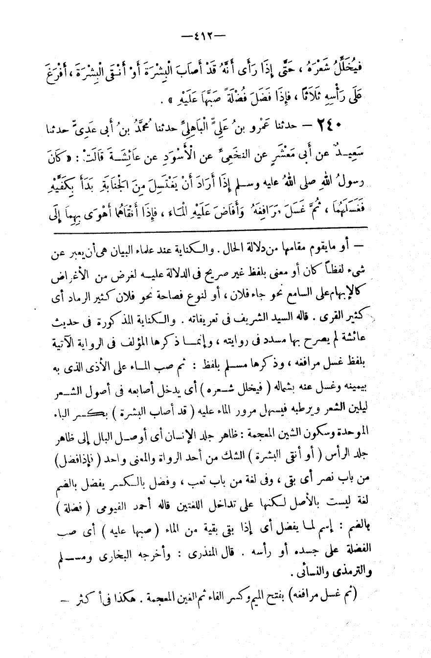 أَوْ مَا يَقُوم مَقَامهَا مِنْ دَلَالَة الْحَال . وَالْكِنَايَة عِنْد عُلَمَاء الْبَيَان هِيَ أَنْ يُعَبَّر عَنْ شَيْء لَفْظًا كَانَ أَوْ مَعْنًى بِلَفْظٍ غَيْر صَرِيح فِي الدَّلَالَة عَلَيْهِ لِغَرَضٍ مِنْ الْأَغْرَاض كَالْإِبْهَامِ عَلَى السَّامِع نَحْو جَاءَ فُلَان ، أَوْ لِنَوْعِ فَصَاحَة نَحْو فُلَان كَثِير الرَّمَاد أَيْ كَثِير الْقِرَى . قَالَهُ السَّيِّد الشَّرِيف فِي تَعْرِيفَاته . وَالْكِنَايَة الْمَذْكُورَة فِي حَدِيث عَائِشَة لَمْ يُصَرِّح بِهَا مُسَدَّد فِي رِوَايَته ، وَإِنَّمَا ذَكَرَهَا الْمُؤَلِّف فِي الرِّوَايَة الْآتِيَة بِلَفْظِ غَسَلَ مَرَافِغَهُ ، وَذَكَرَهَا مُسْلِم بِلَفْظِ : ثُمَّ صَبَّ الْمَاء عَلَى الْأَذَى الَّذِي بِهِ بِيَمِينِهِ وَغَسَلَ عَنْهُ بِشِمَالِهِ