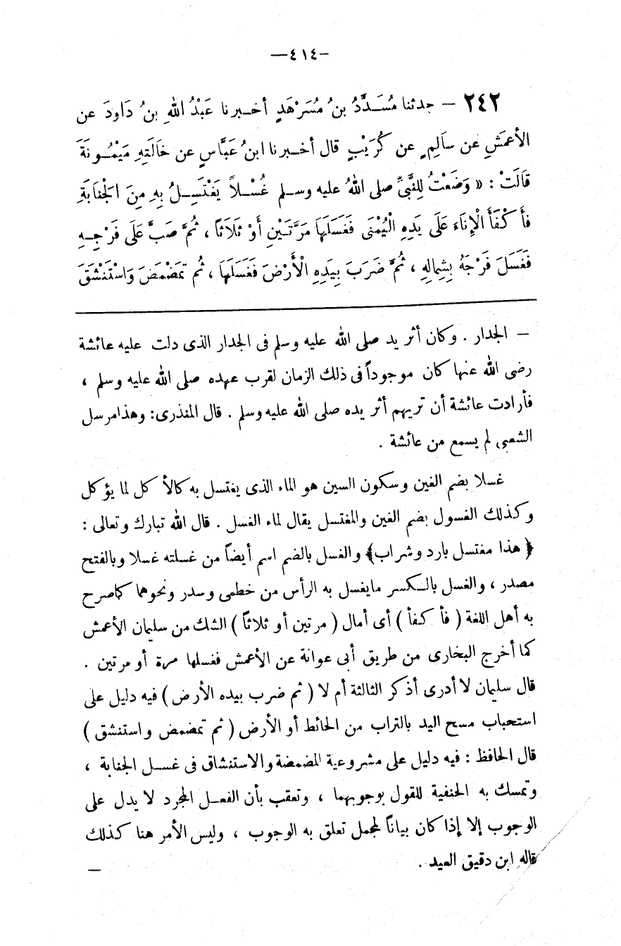 الْجِدَار . وَكَانَ أَثَر يَده صَلَّى اللَّه عَلَيْهِ وَسَلَّمَ فِي الْجِدَار الَّذِي دَلَّتْ عَلَيْهِ عَائِشَة رَضِيَ اللَّه عَنْهَا كَانَ مَوْجُودًا فِي ذَلِكَ الزَّمَان لِقُرْبِ عَهْده صَلَّى اللَّه عَلَيْهِ وَسَلَّمَ ، فَأَرَادَتْ عَائِشَة أَنْ تُرِيَهُمْ أَثَر يَده صَلَّى اللَّه عَلَيْهِ وَسَلَّمَ . قَالَ الْمُنْذِرِيُّ : وَهَذَا مُرْسَلٌ الشَّعْبِيُّ لَمْ يَسْمَع مِنْ عَائِشَة .
