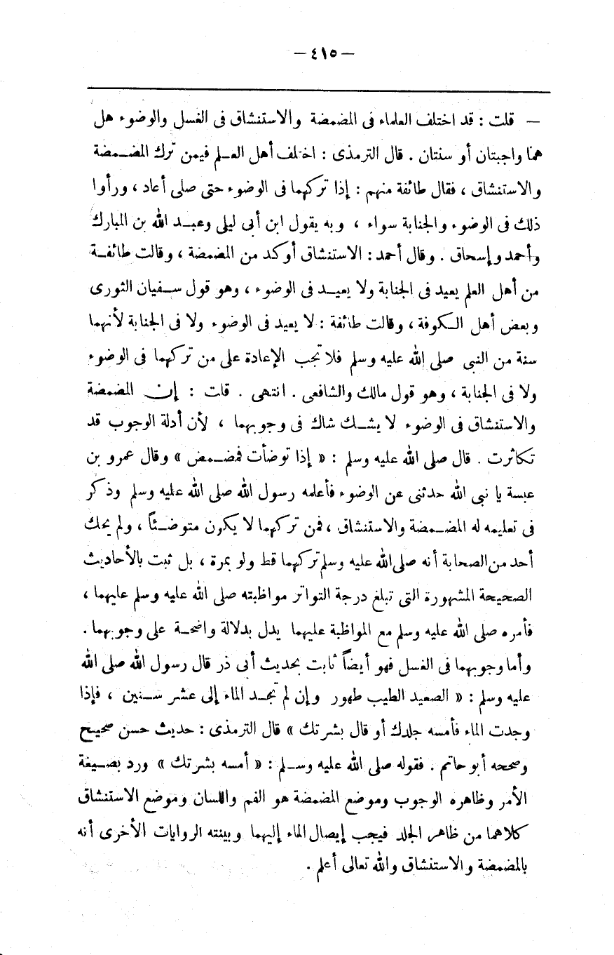 قُلْت : قَدْ اِخْتَلَفَ الْعُلَمَاء فِي الْمَضْمَضَة وَالِاسْتِنْشَاق فِي الْغُسْل وَالْوُضُوء هَلْ هُمَا وَاجِبَتَانِ أَوْ سُنَّتَانِ . قَالَ التِّرْمِذِيّ : اِخْتَلَفَ أَهْل الْعِلْم فِيمَنْ تَرَكَ الْمَضْمَضَة وَالِاسْتِنْشَاق ، فَقَالَ طَائِفَة مِنْهُمْ : إِذَا تَرَكَهُمَا فِي الْوُضُوء حَتَّى صَلَّى أَعَادَ ، وَرَأَوْا ذَلِكَ فِي الْوُضُوء وَالْجَنَابَة سَوَاء ، وَبِهِ يَقُول اِبْن أَبِي لَيْلَى وَعَبْد اللَّه بْن الْمُبَارَك وَأَحْمَد وَإِسْحَاق . وَقَالَ أَحْمَد : الِاسْتِنْشَاق أَوْكَد مِنْ الْمَضْمَضَة ، وَقَالَتْ طَائِفَة مِنْ أَهْل الْعِلْم يُعِيد فِي الْجَنَابَة وَلَا يُعِيد فِي الْوُضُوء ، وَهُوَ قَوْل سُفْيَان الثَّوْرِيّ وَبَعْض أَهْل الْكُوفَة ، وَقَالَتْ طَائِفَة : لَا يُعِيد فِي الْوُضُوء وَلَا فِي الْجَنَابَة لِأَنَّهُمَا سُنَّة مِنْ النَّبِيّ صَلَّى اللَّه عَلَيْهِ وَسَلَّمَ فَلَا تَجِب الْإِعَادَة مِنْ تَرْكهمَا فِي الْوُضُوء وَلَا فِي الْجَنَابَة ، وَهُوَ قَوْل مَالِك وَالشَّافِعِيّ . اِنْتَهَى . قُلْت : إِنَّ الْمَضْمَضَة وَالِاسْتِنْشَاق فِي الْوُضُوء لَا يَشُكّ شَاكّ فِي وُجُوبهمَا ، لِأَنَّ أَدِلَّة الْوُجُوب قَدْ تَكَاثَرَتْ . قَالَ صَلَّى اللَّه عَلَيْهِ وَسَلَّمَ : " إِذَا تَوَضَّأْت فَمَضْمِضْ " وَقَالَ عَمْرو بْن عَبْسَة يَا نَبِيّ اللَّه حَدِّثْنِي عَنْ الْوُضُوء فَأَعْلَمَهُ رَسُول اللَّه صَلَّى اللَّه عَلَيْهِ وَسَلَّمَ وَذَكَرَ فِي تَعْلِيمه لَهُ الْمَضْمَضَة وَالِاسْتِنْشَاق ، فَمَنْ تَرَكَهُمَا لَا يَكُون مُتَوَضِّئًا ، وَلَمْ يَحْكِ أَحَد مِنْ الصَّحَابَة أَنَّهُ صَلَّى اللَّه عَلَيْهِ وَسَلَّمَ تَرَكَهُمَا قَطّ وَلَوْ بِمَرَّةٍ ، بَلْ ثَبَتَ بِالْأَحَادِيثِ الصَّحِيحَة الْمَشْهُورَة الَّتِي تَبْلُغ دَرَجَة التَّوَاتُر مُوَاظَبَته صَلَّى اللَّه عَلَيْهِ وَسَلَّمَ عَلَيْهِمَا ، فَأَمْره صَلَّى اللَّه عَلَيْهِ وَسَلَّمَ مَعَ الْمُوَاظَبَة عَلَيْهِمَا يَدُلّ بِدَلَالَةٍ وَاضِحَة عَلَى وُجُوبهمَا . وَأَمَّا وُجُوبهمَا فِي الْغُسْل فَهُوَ أَيْضًا ثَابِت بِحَدِيثِ أَبِي ذَرّ قَالَ رَسُول اللَّه صَلَّى اللَّه عَلَيْهِ وَسَلَّمَ : " الصَّعِيد الطَّيِّب طَهُور وَإِنْ لَمْ تَجِد الْمَاء إِلَى عَشْر سِنِينَ ، فَإِذَا وَجَدْت الْمَاء فَأَمِسَّهُ جِلْدك أَوْ قَالَ بَشَرَتك " قَالَ التِّرْمِذِيّ : حَدِيث حَسَن صَحِيح وَصَحَّحَهُ أَبُو حَاتِم . فَقَوْله صَلَّى اللَّه عَلَيْهِ وَسَلَّمَ : " أَمِسَّهُ بَشَرَتك " وَرَدَ بِصِيغَةِ الْأَمْر وَظَاهِره الْوُجُوب وَمَوْضِع الْمَضْمَضَة هُوَ الْفَم وَاللِّسَان وَمَوْضِع الِاسْتِنْشَاق كِلَاهُمَا مِنْ ظَاهِر الْجِلْد فَيَجِب إِيصَال الْمَاء إِلَيْهِمَا وَبَيَّنَتْهُ الرِّوَايَات الْأُخْرَى أَنَّهُ بِالْمَضْمَضَةِ وَالِاسْتِنْشَاق وَاَللَّه تَعَالَى أَعْلَم .@