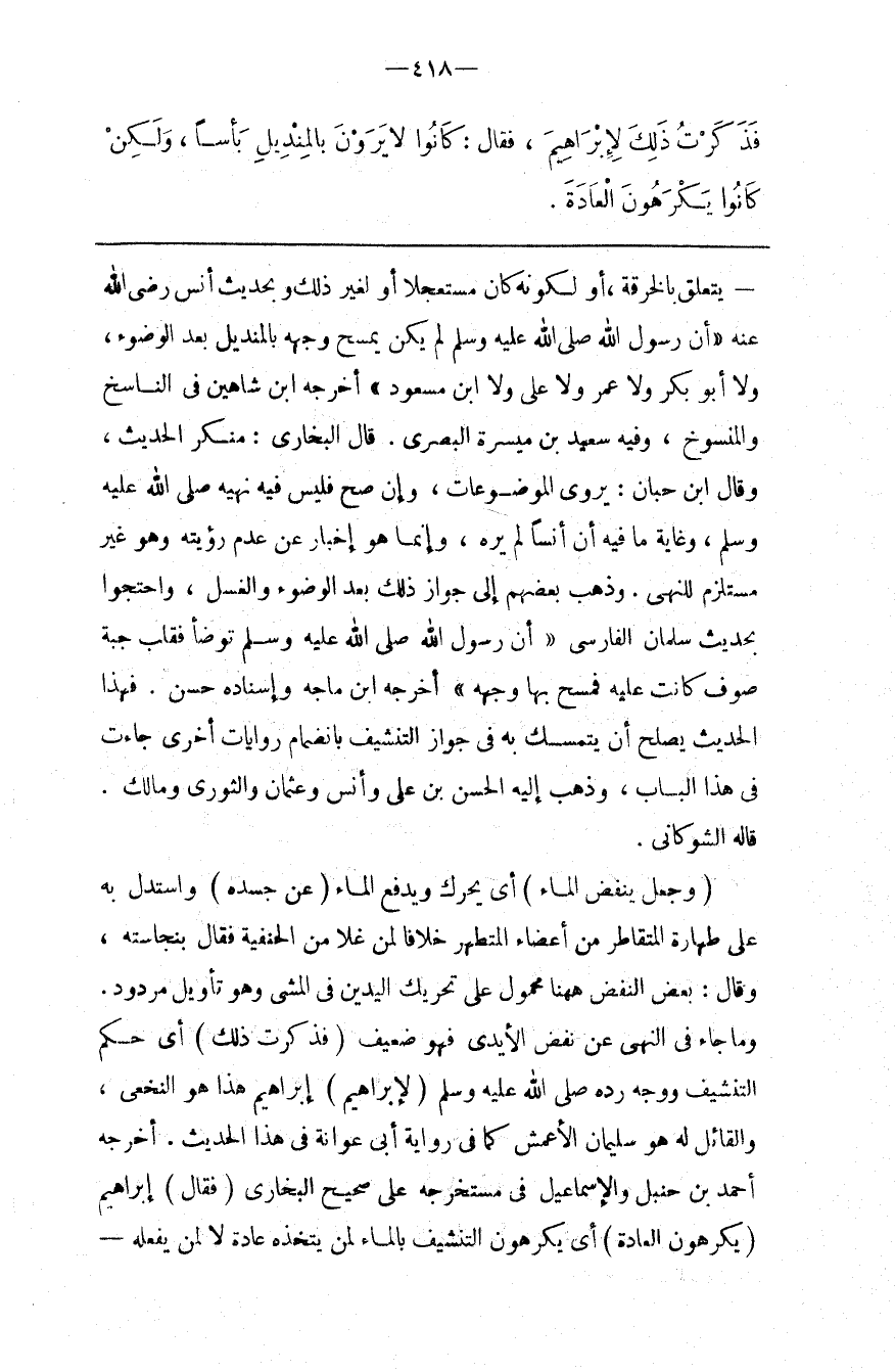 يَتَعَلَّق بِالْخِرْقَةِ ، أَوْ لِكَوْنِهِ كَانَ مُسْتَعْجِلًا أَوْ لِغَيْرِ ذَلِكَ وَبِحَدِيثِ أَنَس رَضِيَ اللَّه عَنْهُ " أَنَّ رَسُول اللَّه صَلَّى اللَّه عَلَيْهِ وَسَلَّمَ لَمْ يَكُنْ يَمْسَح وَجْهه بِالْمِنْدِيلِ بَعْد الْوُضُوء ، وَلَا أَبُو بَكْر وَلَا عُمَر وَلَا عَلِيّ وَلَا اِبْن مَسْعُود " أَخْرَجَهُ اِبْن شَاهِين فِي النَّاسِخ وَالْمَنْسُوخ ، وَفِيهِ سَعِيد بْن مَيْسَرَة الْبَصْرِيّ . قَالَ الْبُخَارِيّ : مُنْكَر الْحَدِيث ، وَقَالَ اِبْن حِبَّان : يَرْوِي الْمَوْضُوعَات ، وَإِنْ صَحَّ فَلَيْسَ فِيهِ نَهْيه صَلَّى اللَّه عَلَيْهِ وَسَلَّمَ ، وَغَايَة مَا فِيهِ أَنَّ أَنَسًا لَمْ يَرَهُ ، وَإِنَّمَا هُوَ إِخْبَار عَنْ عَدَم رُؤْيَته وَهُوَ غَيْر مُسْتَلْزِم لِلنَّهْيِ . وَذَهَبَ بَعْضهمْ إِلَى جَوَاز ذَلِكَ بَعْد الْوُضُوء وَالْغُسْل ، وَاحْتَجُّوا بِحَدِيثِ سَلْمَان الْفَارِسِيّ " أَنَّ رَسُول اللَّه صَلَّى اللَّه عَلَيْهِ وَسَلَّمَ تَوَضَّأَ فَقَلَبَ جُبَّة صُوف كَانَتْ عَلَيْهِ فَمَسَحَ بِهَا وَجْهه " أَخْرَجَهُ اِبْن مَاجَهْ وَإِسْنَاده حَسَن . فَهَذَا الْحَدِيث يَصْلُح أَنْ يُتَمَسَّك بِهِ فِي جَوَاز التَّنْشِيف بِانْضِمَامِ رِوَايَات أُخْرَى جَاءَتْ فِي هَذَا الْبَاب ، وَذَهَبَ إِلَيْهِ الْحَسَن بْن عَلِيّ وَأَنَس وَعُثْمَان وَالثَّوْرِيُّ وَمَالِك . قَالَهُ الشَّوْكَانِيُّ .