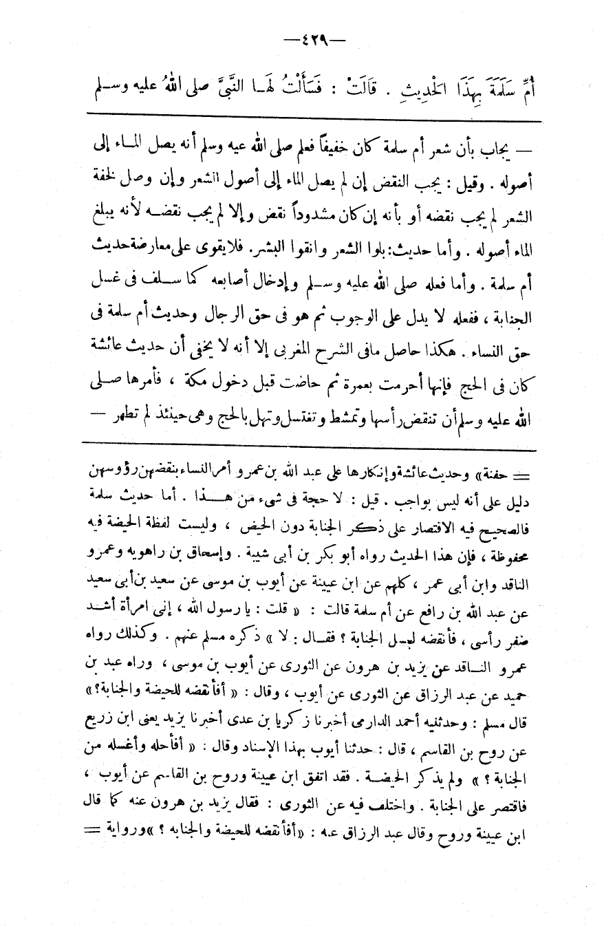 أما حديث سلمة فالصحيح فيه الاقتصار على ذكر الجنابة دون الحيض وليست لفظة الحيضة فيه محفوظة فإن هذا الحديث رواه أبو بكر بن أبي شيبة
