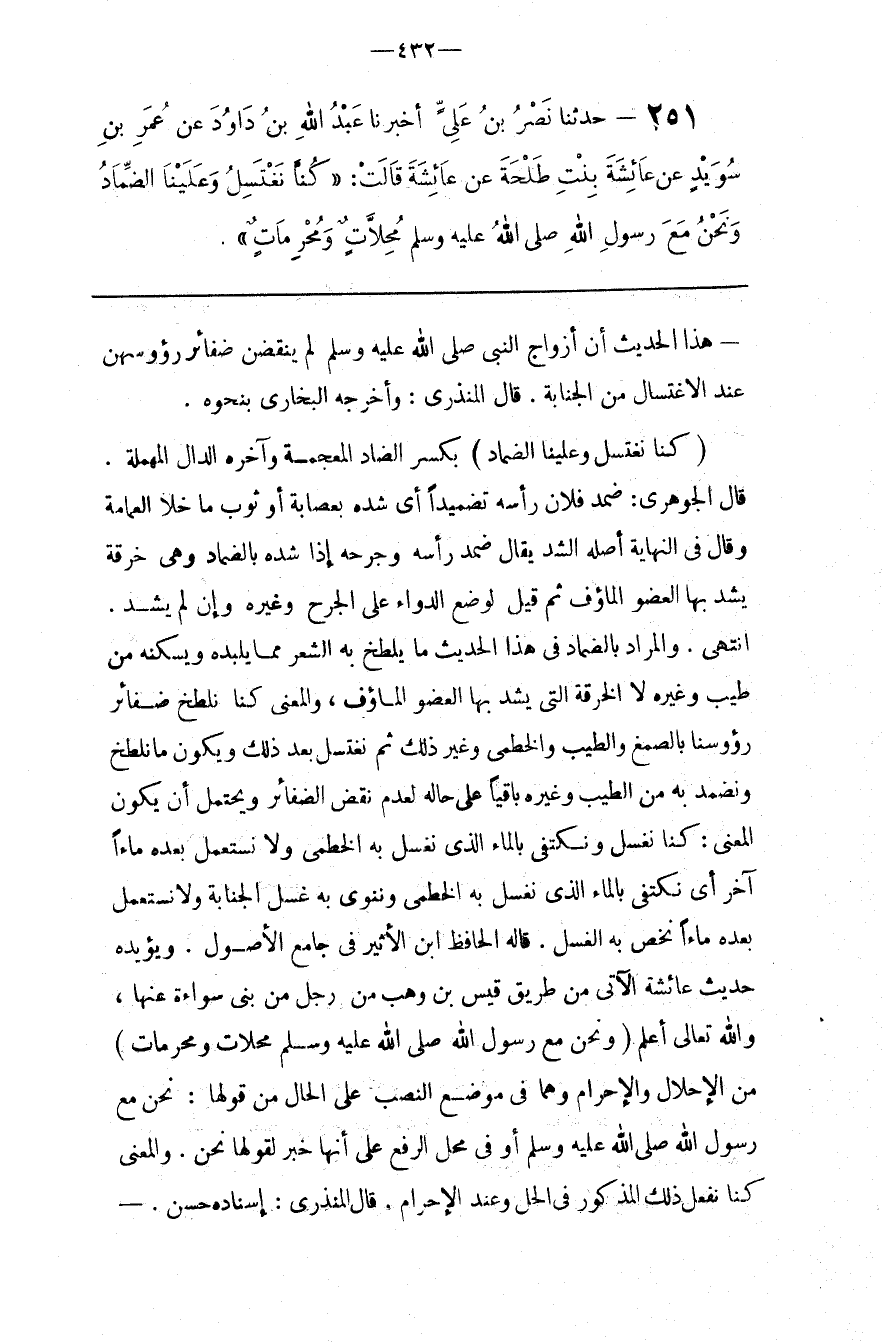 قَالَ الْجَوْهَرِيّ : ضَمَّدَ فُلَان رَأْسه تَضْمِيدًا أَيْ شَدَّهُ بِعِصَابَةٍ أَوْ ثَوْب مَا خَلَا الْعِمَامَة وَقَالَ فِي النِّهَايَة أَصْله الشَّدّ يُقَال ضَمَّدَ رَأْسه وَجُرْحه إِذَا شَدَّهُ بِالضِّمَادِ وَهِيَ خِرْقَة يُشَدّ بِهَا الْعُضْو الْمَئُوف ثُمَّ قِيلَ لِوَضْعِ الدَّوَاء عَلَى الْجُرْح وَغَيْره وَإِنْ لَمْ يُشَدّ . اِنْتَهَى . وَالْمُرَاد بِالضِّمَادِ فِي هَذَا الْحَدِيث مَا يُلَطَّخ بِهِ الشَّعْر مِمَّا يُلَبِّدهُ وَيُسَكِّنهُ مِنْ طِيب وَغَيْره لَا الْخِرْقَة الَّتِي يُشَدّ بِهَا الْعُضْو الْمَئُوف ، وَالْمَعْنَى كُنَّا نُلَطِّخ ضَفَائِر رُءُوسنَا بِالصَّمْغِ وَالطِّيب وَالْخِطْمِيّ وَغَيْر ذَلِكَ ثُمَّ نَغْتَسِل بَعْد ذَلِكَ وَيَكُون مَا نُلَطِّخ وَنُضَمِّد بِهِ مِنْ الطِّيب وَغَيْره بَاقِيًا عَلَى حَاله لِعَدَمِ نَقْضِ الضَّفَائِر وَيَحْتَمِل أَنْ يَكُون الْمَعْنَى : كُنَّا نَغْسِل وَنَكْتَفِي بِالْمَاءِ الَّذِي نَغْسِل بِهِ الْخِطْمِيّ وَلَا نَسْتَعْمِل بَعْده مَاء آخَر أَيْ نَكْتَفِي بِالْمَاءِ الَّذِي نَغْسِل بِهِ الْخِطْمِيّ وَنَنْوِي بِهِ غُسْل الْجَنَابَة وَلَا نَسْتَعْمِل بَعْده مَاء نَخُصّ بِهِ الْغُسْل . قَالَهُ الْحَافِظ اِبْن الْأَثِير فِي جَامِع الْأُصُول . وَيُؤَيِّدهُ حَدِيث عَائِشَة الْآتِي مِنْ طَرِيق قَيْس بْن وَهْب عَنْ رَجُل مِنْ بَنِي سُوَاءَة عَنْهَا ، وَاَللَّه تَعَالَى أَعْلَم