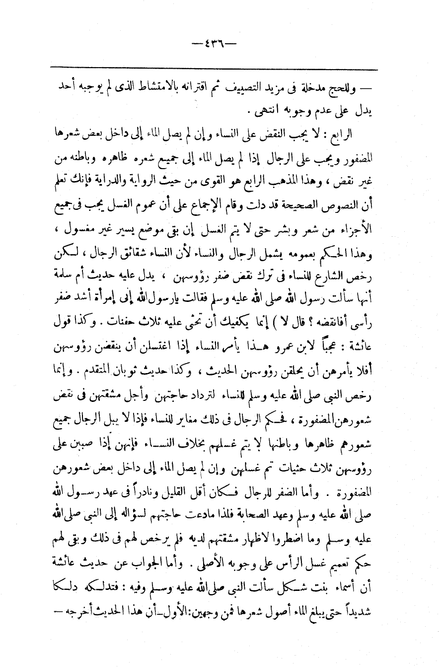 الرَّابِع : لَا يَجِب النَّقْض عَلَى النِّسَاء وَإِنْ لَمْ يَصِل الْمَاء إِلَى دَاخِل بَعْض شَعْرهَا الْمَضْفُور وَيَجِب عَلَى الرَّجُل إِذَا لَمْ يَصِل الْمَاء إِلَى جَمِيع شَعْره ظَاهِره وَبَاطِنه مِنْ غَيْر نَقْض ، وَهَذَا الْمَذْهَب الرَّابِع هُوَ الْقَوِيّ مِنْ حَيْثُ الرِّوَايَة وَالدِّرَايَة فَإِنَّك تَعْلَم أَنَّ النُّصُوص الصَّحِيحَة قَدْ دَلَّتْ وَقَامَ الْإِجْمَاع عَلَى أَنَّ عُمُوم الْغُسْل يَجِب فِي جَمِيع الْأَجْزَاء مِنْ شَعْر وَبَشَر حَتَّى لَا يَتِمّ الْغُسْل إِنْ بَقِيَ مَوْضِع يَسِير غَيْر مَغْسُول ، وَهَذَا الْحُكْم بِعُمُومِهِ يَشْمَل الرِّجَال وَالنِّسَاء لِأَنَّ النِّسَاء شَقَائِق الرِّجَال ، لَكِنْ رَخَّصَ الشَّارِع لِلنِّسَاءِ فِي تَرْك نَقْض ضَفْر رُءُوسهنَّ ، يَدُلّ عَلَيْهِ حَدِيث أُمّ سَلَمَة أَنَّهَا سَأَلَتْ رَسُول اللَّه صَلَّى اللَّه عَلَيْهِ وَسَلَّمَ فَقَالَتْ يَا رَسُول اللَّه إِنِّي اِمْرَأَة أَشُدّ ضَفْر رَأْسِي أَفَأَنْقُضهُ ؟ قَالَ لَا إِنَّمَا يَكْفِيك أَنْ تَحْثِي عَلَيْهِ ثَلَاث حَفَنَات . وَكَذَا قَوْل عَائِشَة : عَجَبًا لِابْنِ عَمْرو هَذَا يَأْمُر النِّسَاء إِذَا اِغْتَسَلْنَ أَنْ يَنْقُضْنَ رُءُوسهنَّ أَفَلَا يَأْمُرهُنَّ أَنْ يَحْلِقْنَ رُءُوسهنَّ الْحَدِيث ، وَكَذَا حَدِيث ثَوْبَانَ الْمُتَقَدِّم . وَإِنَّمَا رَخَّصَ النَّبِيّ صَلَّى اللَّه عَلَيْهِ وَسَلَّمَ لِلنِّسَاءِ لِتَرْدَادِ حَاجَتهنَّ وَأَجْل مَشَقَّتهنَّ فِي نَقْض شُعُورهنَّ الْمَضْفُورَة ، فَحُكْم الرِّجَال فِي ذَلِكَ مُغَايِر لِلنِّسَاءِ فَإِذَا لَمْ يَبُلّ الرِّجَال جَمِيع شُعُورهمْ ظَاهِرهَا وَبَاطِنهَا لَا يَتِمّ غُسْلهمْ ، بِخِلَافِ النِّسَاء فَإِنَّهُنَّ إِذَا صَبَبْنَ عَلَى رُءُوسهنَّ ثَلَاث حَثَيَات تَمَّ غُسْلهنَّ وَإِنْ لَمْ يَصِل الْمَاء إِلَى دَاخِل بَعْض شُعُورهنَّ الْمَضْفُورَة . وَأَمَّا الضَّفْر لِلرِّجَالِ فَكَانَ أَقَلّ الْقَلِيل وَنَادِرًا فِي عَهْد رَسُول اللَّه صَلَّى اللَّه عَلَيْهِ وَسَلَّمَ وَعَهْد الصَّحَابَة فَلِذَا مَا دَعَتْ حَاجَتهمْ لِسُؤَالِهِ إِلَى النَّبِيّ صَلَّى اللَّه عَلَيْهِ وَسَلَّمَ وَمَا اُضْطُرُّوا لِإِظْهَارِ مَشَقَّتهمْ لَدَيْهِ فَلَمْ يُرَخِّص لَهُمْ فِي ذَلِكَ وَبَقِيَ لَهُمْ حُكْم تَعْمِيم غَسْل الرَّأْس عَلَى وُجُوبه الْأَصْلِيّ . وَأَمَّا الْجَوَاب عَنْ حَدِيث عَائِشَة أَنَّ أَسْمَاء بِنْت شَكَل سَأَلْت النَّبِيّ صَلَّى اللَّه عَلَيْهِ وَسَلَّمَ وَفِيهِ : فَتُدَلِّكهُ دَلْكًا شَدِيدًا حَتَّى يَبْلُغ الْمَاء أُصُول شَعْرهَا فَمِنْ وَجْهَيْنِ : الْأَوَّل أَنَّ هَذَا الْحَدِيث أَخْرَجَهُ@