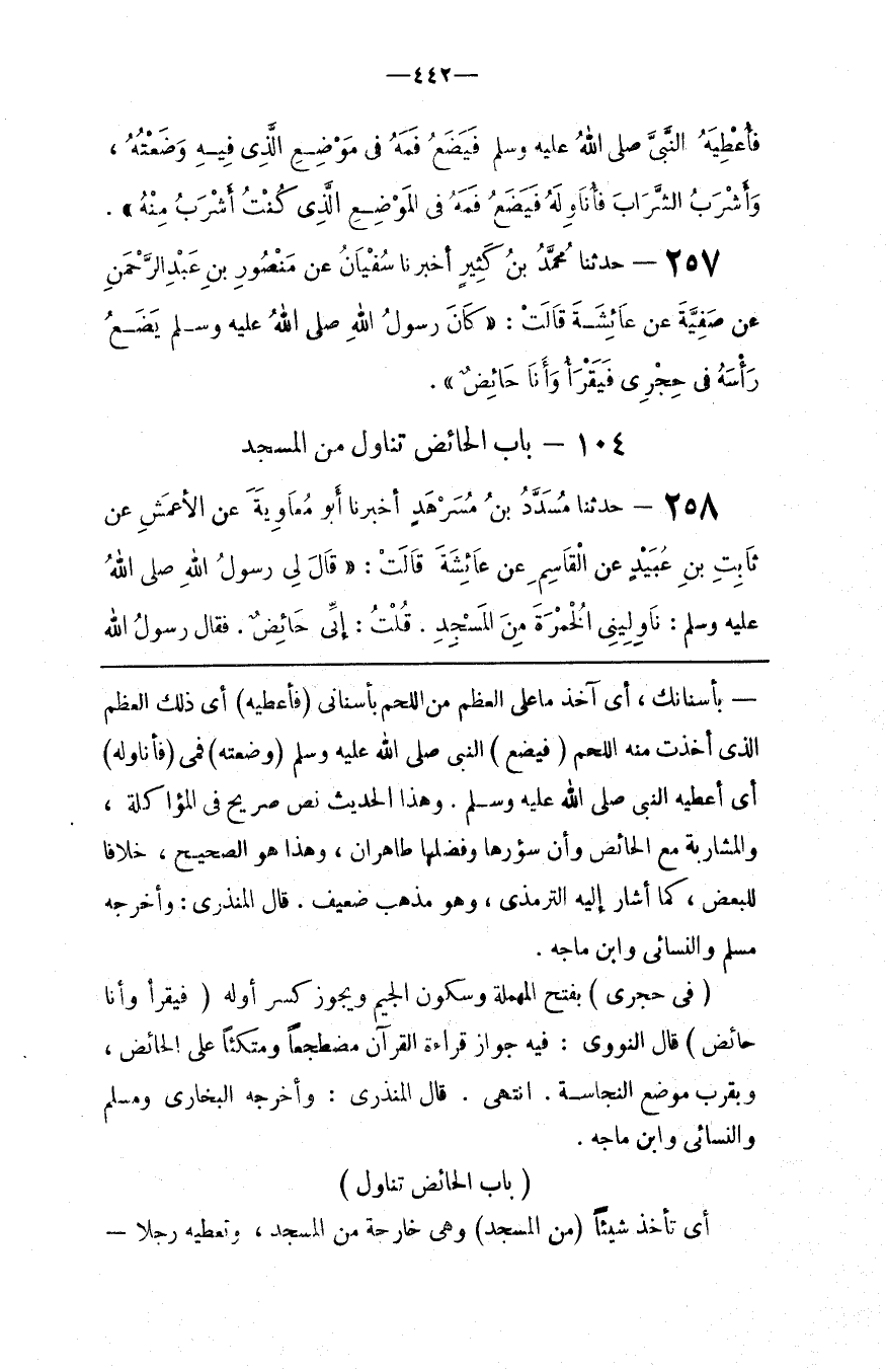 قَالَ النَّوَوِيّ : فِيهِ جَوَاز قِرَاءَة الْقُرْآن مُضْطَجِعًا وَمُتَّكِئًا عَلَى الْحَائِض ، وَبِقُرْبِ مَوْضِع النَّجَاسَة . اِنْتَهَى . قَالَ الْمُنْذِرِيُّ : وَأَخْرَجَهُ الْبُخَارِيّ وَمُسْلِم وَالنَّسَائِيُّ وَابْن مَاجَهْ .