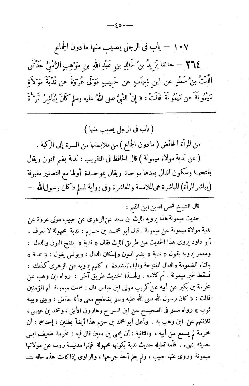 قال الشيخ شمس الدين بن القيم حديث ميمونة هذا يرويه الليث بن سعد عن الزهري عن حبيب مولى عروة عن ندبة مولاة ميمونة عن ميمونة