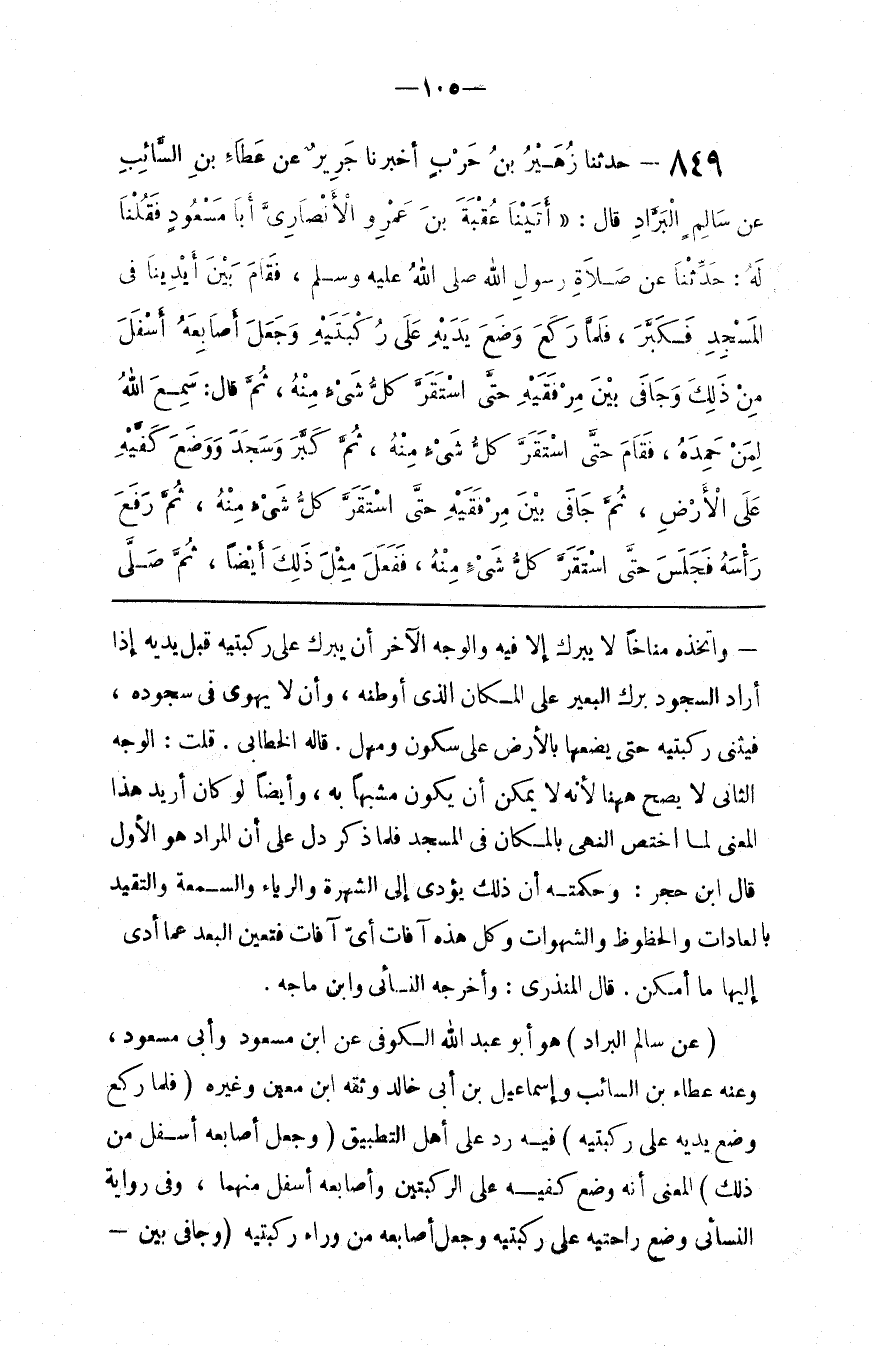 وَاِتَّخَذَهُ مَنَاخًا لَا يَبْرُك إِلَّا فِيهِ وَالْوَجْه الْآخَر أَنْ يَبْرُك عَلَى رُكْبَتَيْهِ قَبْل يَدَيْهِ إِذَا أَرَادَ السُّجُود بَرْك الْبَعِير عَلَى الْمَكَان الَّذِي أَوْطَنَهُ ، وَأَنْ لَا يَهْوِي فِي سُجُوده ، فَيُثْنِي رُكْبَتَيْهِ حَتَّى يَضَعهَا بِالْأَرْضِ عَلَى سُكُون وَمَهْل . قَالَهُ الْخَطَّابِيُّ .