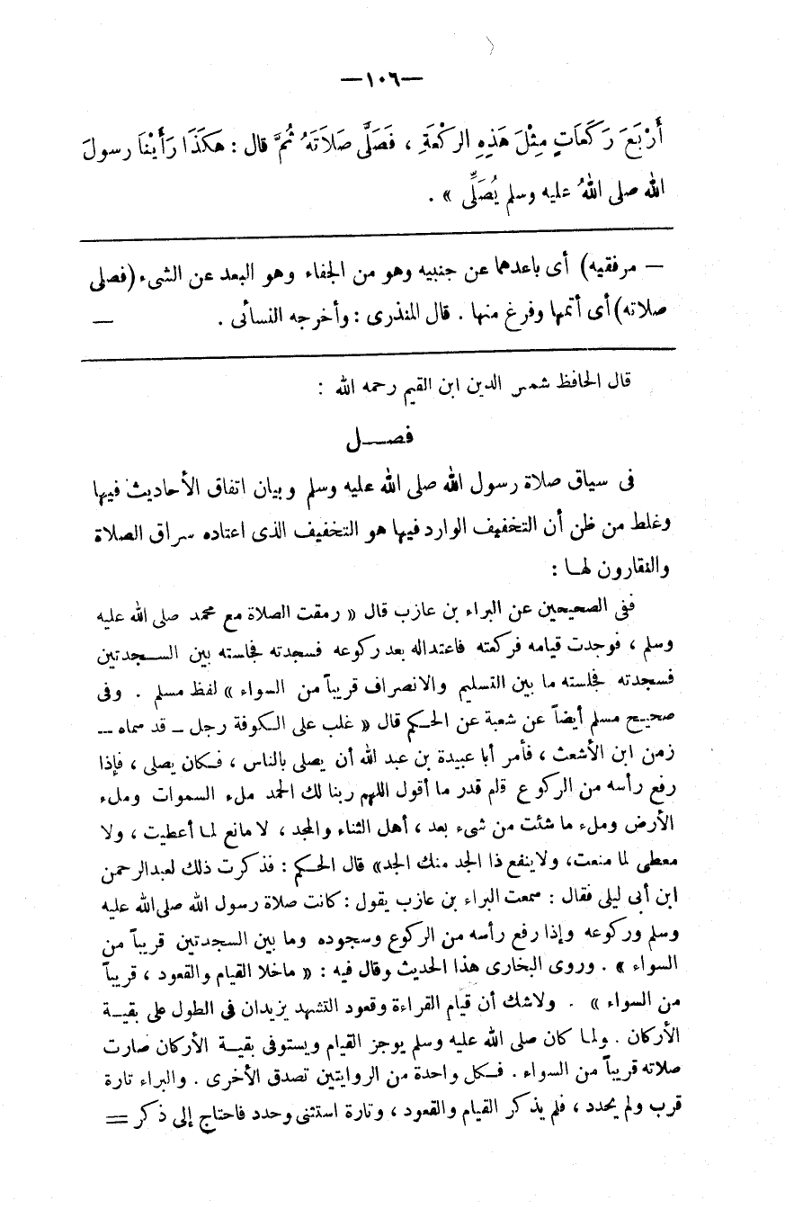 صلى الله عليه و سلم وبيان اتفاق الأحاديث فيها وغلط من ظن أن التخفيف الوارد فيها هو التخفيف الذي اعتادة سراق الصلاة والنقارون لها ففي الصحيحين عن البراء بن عازب قال رمقت الصلاة مع محمد صلى الله عليه و سلم فوجدت قيامه فركعته فاعتدالة بعد ركوعه فسجدته فجلسته بين السجدتين فسجدته فجلسته ما بين التسليم والانصراف قريبا من السواء لفظ مسلم