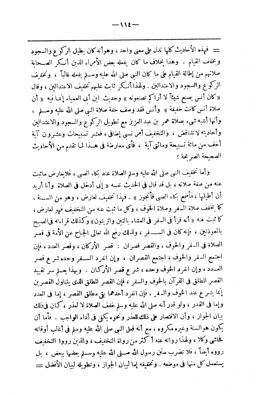 ولهذا انكر ثابت عليهم تخفيف الاعتدالين وقال كان أنس يصنع شيئا لا أراكم تصنعونه وحديث ابن أبي العمياء إنما فيه أن صلاة أنس كانت خفيفة وأنس فقد وصف خفة صلاة النبي صلى الله عليه و سلم وأنها أشبه شيء بصلاة عمر بن عبدالعزيز مع تطويل الركوع والسجود والاعتدالين وأحاديثه لاتتناقض والتخفيف أمر نسبي إضافي فعشر تسبيحات وعشرون آية أخف من مائة تسبيحة ومائتي آية فأي معارضة في هذا لما تقدم من الأحاديث الصحيحة الصريحة