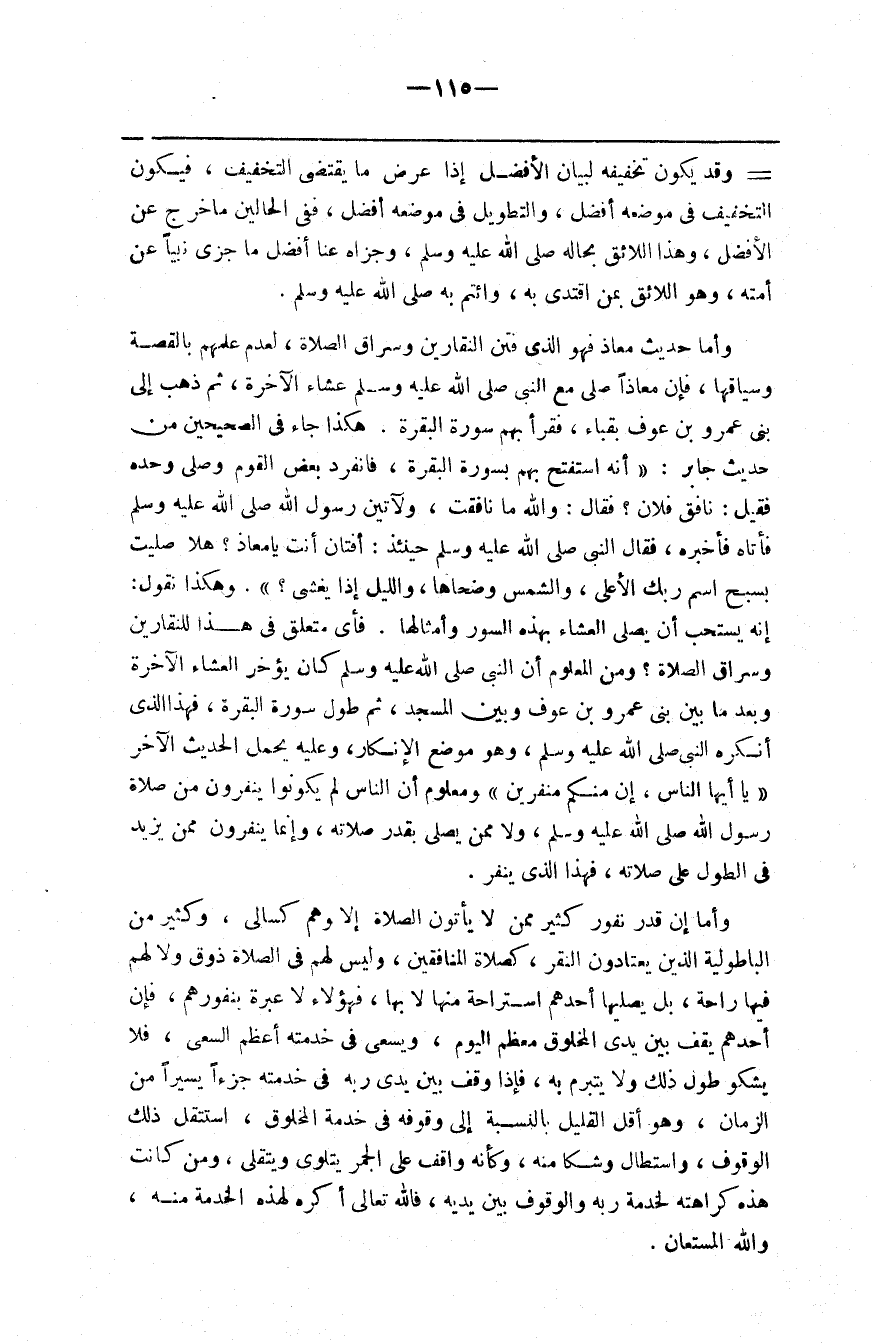 فأي متعلق في هذا للنقارين وسراق الصلاة ومن المعلوم أن النبي صلى الله عليه و سلم كان يؤخر العشاء الآخرة وبعد ما بين بني عمرو بن عوف وبين السمجد ثم طول سورة البقرة فهذا الذي أنكره النبي صلى الله عليه و سلم وهو موضع الإنكار وعليه يحمل الحديث الآخر ياأيها الناس