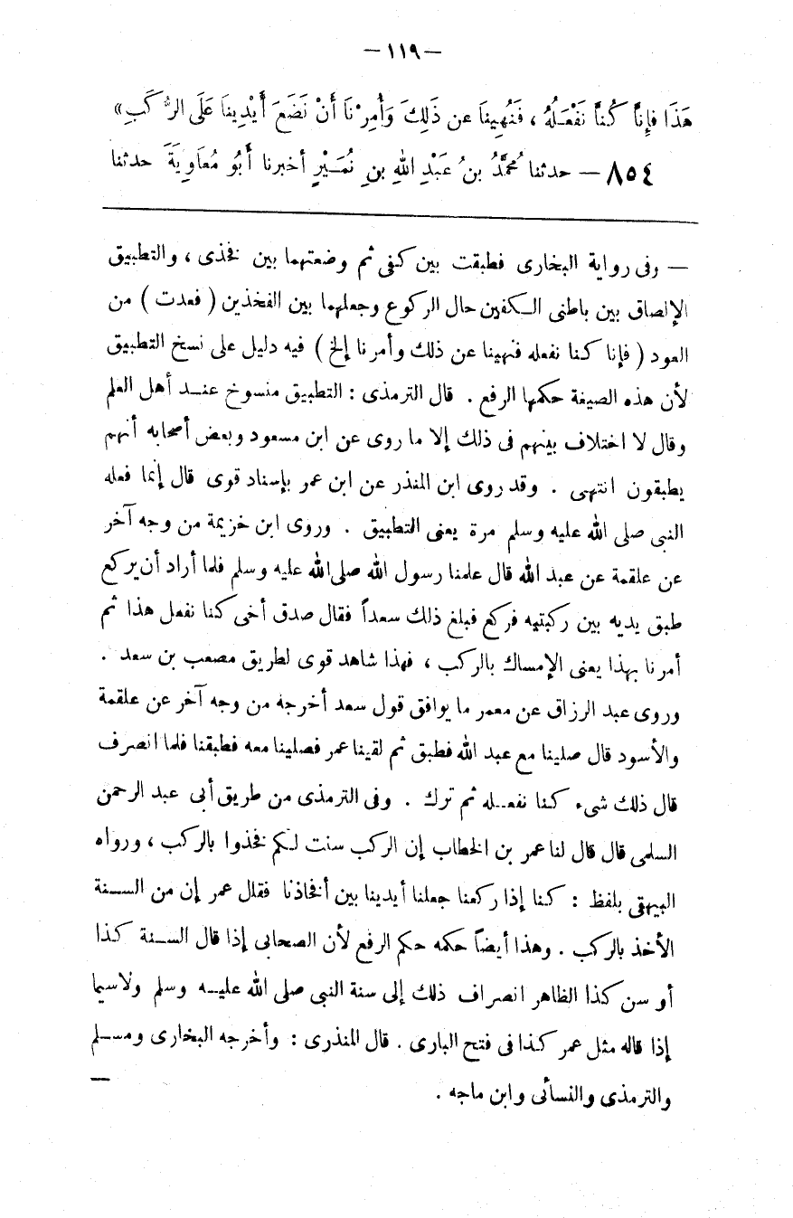 : وَفِي رِوَايَة الْبُخَارِيّ فَطَبَّقْت بَيْن كَفَّيَّ ثُمَّ وَضَعْتهمَا بَيْن فَخِذَيَّ ، وَالتَّطْبِيق الْإِلْصَاق بَيْن بَاطِنَيْ الْكَفَّيْنِ حَال الرُّكُوع وَجَعْلهمَا بَيْن الْفَخِذَيْنِ