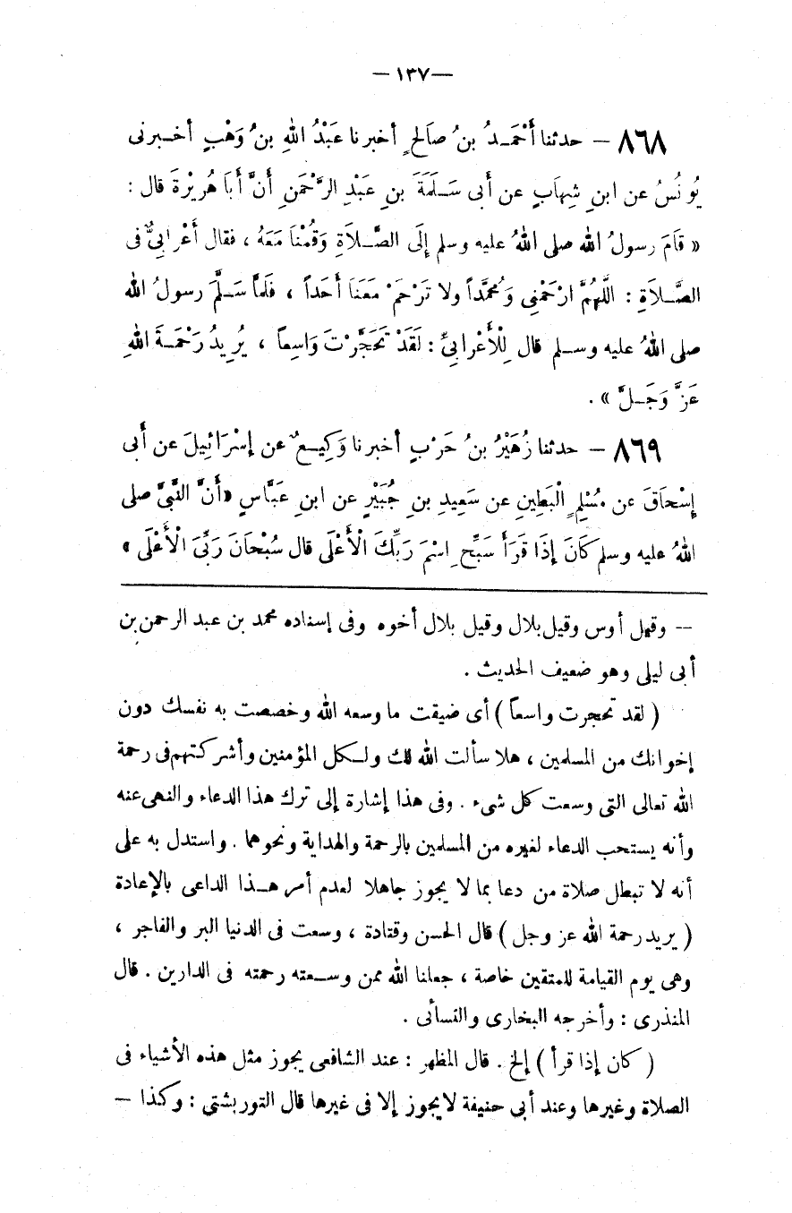 : أَيْ ضَيَّقْت مَا وَسَّعَهُ اللَّه وَخَصَّصْت بِهِ نَفْسك دُون إِخْوَانك مِنْ الْمُسْلِمِينَ ، هَلَّا سَأَلْت اللَّه لَك وَلِكُلِّ الْمُؤْمِنِينَ وَأَشْرَكْتهمْ فِي رَحْمَة اللَّه تَعَالَى الَّتِي وَسِعَتْ كُلّ شَيْء . وَفِي هَذَا إِشَارَة إِلَى تَرْك هَذَا الدُّعَاء وَالنَّهْي عَنْهُ وَأَنَّهُ يُسْتَحَبّ الدُّعَاء لِغَيْرِهِ مِنْ الْمُسْلِمِينَ بِالرَّحْمَةِ وَالْهِدَايَة وَنَحْوهمَا . وَاسْتُدِلَّ بِهِ عَلَى أَنَّهُ لَا تَبْطُل صَلَاة مَنْ دَعَا بِمَا لَا يَجُوز جَاهِلًا لِعَدَمِ أَمْر هَذَا الدَّاعِي بِالْإِعَادَةِ
