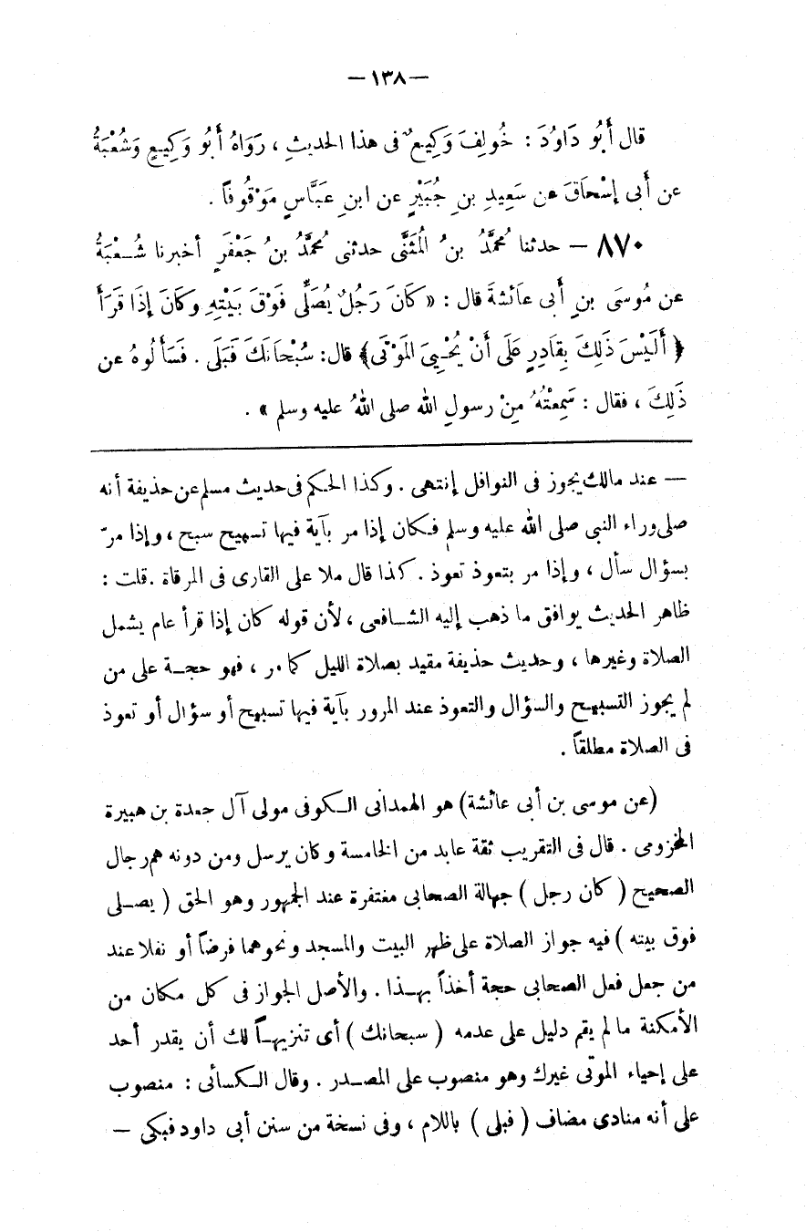 عِنْد مَالِك يَجُوز فِي النَّوَافِل اِنْتَهَى . وَكَذَا الْحُكْم فِي حَدِيث مُسْلِم عَنْ حُذَيْفَة أَنَّهُ صَلَّى وَرَاء النَّبِيّ صَلَّى اللَّه عَلَيْهِ وَسَلَّمَ فَكَانَ إِذَا مَرَّ بِآيَةٍ فِيهَا تَسْبِيح سَبَّحَ ، وَإِذَا مَرَّ بِسُؤَالٍ سَأَلَ ، وَإِذَا مَرَّ بِتَعَوُّذٍ تَعَوَّذَ . كَذَا قَالَ مُلَّا عَلَى الْقَارِي فِي الْمِرْقَاة .