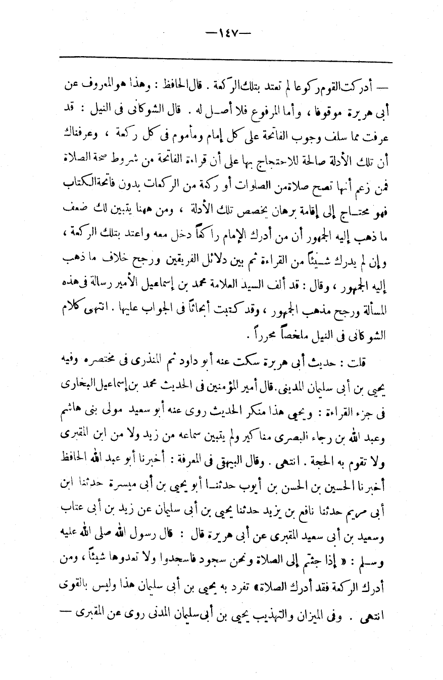 أَدْرَكْت الْقَوْم رُكُوعًا لَمْ تَعْتَدّ بِتِلْكَ الرَّكْعَة . قَالَ الْحَافِظ : وَهَذَا هُوَ الْمَعْرُوف عَنْ أَبِي هُرَيْرَة مَوْقُوفًا ، وَأَمَّا الْمَرْفُوع فَلَا أَصْل لَهُ . قَالَ الشَّوْكَانِيُّ فِي النَّيْل : قَدْ عَرَفْت مِمَّا سَلَفَ وُجُوب الْفَاتِحَة عَلَى كُلّ إِمَام وَمَأْمُوم فِي كُلّ رَكْعَة ، وَعَرَّفْنَاك أَنَّ تِلْكَ الْأَدِلَّة صَالِحَة لِلِاحْتِجَاجِ بِهَا عَلَى أَنَّ قِرَاءَة الْفَاتِحَة مِنْ شُرُوط صِحَّة الصَّلَاة فَمَنْ زَعَمَ أَنَّهَا تَصِحّ صَلَاة مِنْ الصَّلَوَات أَوْ رَكْعَة مِنْ الرَّكَعَات بِدُونِ فَاتِحَة الْكِتَاب فَهُوَ مُحْتَاج إِلَى إِقَامَة بُرْهَان يُخَصِّص تِلْكَ الْأَدِلَّة ، وَمِنْ هَاهُنَا يَتَبَيَّن لَك ضَعْف مَا ذَهَبَ إِلَيْهِ الْجُمْهُور أَنَّ مَنْ أَدْرَكَ الْإِمَام رَاكِعًا دَخَلَ مَعَهُ وَاعْتَدَّ بِتِلْكَ الرَّكْعَة ، وَإِنْ لَمْ يُدْرِك شَيْئًا مِنْ الْقِرَاءَة ثُمَّ بَيَّنَ دَلَائِل الْفَرِيقَيْنِ وَرَجَّحَ خِلَاف مَا ذَهَبَ إِلَيْهِ الْجُمْهُور ، وَقَالَ : قَدْ أَلَّفَ السَّيِّد الْعَلَّامَة مُحَمَّد بْن إِسْمَاعِيل الْأَمِير رِسَالَة فِي هَذِهِ الْمَسْأَلَة وَرَجَّحَ مَذْهَب الْجُمْهُور ، وَقَدْ كَتَبْت أَبْحَاثًا فِي الْجَوَاب عَلَيْهَا . اِنْتَهَى كَلَام الشَّوْكَانِيِّ فِي النَّيْل مُلَخَّصًا مُحَرَّرًا .