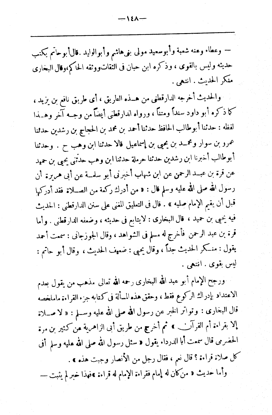 وَرَجَّحَ الْإِمَام أَوْ عَبْد اللَّه الْبُخَارِيّ رَحِمَهُ اللَّه تَعَالَى مَذْهَب مَنْ يَقُول بِعَدَمِ الِاعْتِدَاد بِإِدْرَاكِ الرُّكُوع فَقَطْ ، وَحَقَّقَ هَذِهِ الْمَسْأَلَة فِي كِتَابه جُزْء الْقِرَاءَة مَا مُلَخَّصه قَالَ الْبُخَارِيّ : وَتَوَاتُر الْخَبَر عَنْ رَسُول اللَّه صَلَّى اللَّه عَلَيْهِ وَسَلَّمَ : " لَا صَلَاة إِلَّا بِقِرَاءَةِ أُمّ الْقُرْآن " ثُمَّ أَخْرَجَ مِنْ طَرِيق أَبِي الزَّاهِرِيَّة عَنْ كَثِير بْن مُرَّة الْحَضْرَمِيّ قَالَ سَمِعْت أَبَا الدَّرْدَاء يَقُول " سُئِلَ رَسُول اللَّه صَلَّى اللَّه عَلَيْهِ وَسَلَّمَ أَفِي كُلّ صَلَاة قِرَاءَة ؟ قَالَ نَعَمْ ، فَقَالَ رَجُل مِنْ الْأَنْصَار وَجَبَتْ هَذِهِ " .