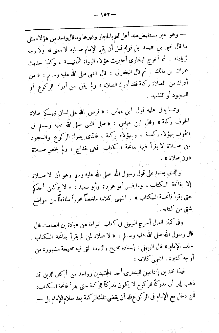 فَهَذَا مُحَمَّد بْن إِسْمَاعِيل الْبُخَارِيّ أَحَد الْمُجْتَهِدِينَ وَوَاحِد مِنْ أَرْكَان الدِّين قَدْ ذَهَبَ إِلَى أَنَّ مُدْرِكًا لِلرُّكُوعِ لَا يَكُون مُدْرِكًا لِلرَّكْعَةِ حَتَّى يَقْرَأ فَاتِحَة الْكِتَاب ، فَمَنْ دَخَلَ مَعَ الْإِمَام فِي الرُّكُوع فَلَهُ أَنْ يَقْضِي تِلْكَ الرَّكْعَة بَعْد سَلَام الْإِمَام بَلْ@