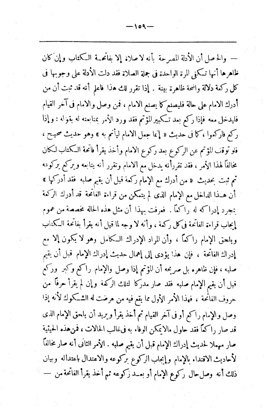 وَالْحَاصِل أَنَّ الْأَدِلَّة الْمُصَرِّحَة بِأَنْ لَا صَلَاة إِلَّا بِفَاتِحَةِ الْكِتَاب وَإِنْ كَانَ ظَاهِرهَا أَنَّهَا تَكْفِي الْمَرَّة الْوَاحِدَة فِي جُمْلَة الصَّلَاة فَقَدْ دَلَّتْ الْأَدِلَّة عَلَى وُجُوبهَا فِي كُلّ رَكْعَة دَلَالَة وَاضِحَة ظَاهِرَة بَيِّنَة . إِذَا تَقَرَّرَ لَك هَذَا فَاعْلَمْ أَنَّهُ قَدْ ثَبَتَ أَنَّ مَنْ أَدْرَكَ الْإِمَام عَلَى حَاله فَلْيَصْنَعْ كَمَا يَصْنَع الْإِمَام ، فَمَنْ وَصَلَ وَالْإِمَام فِي آخِر الْقِيَام فَلْيَدْخُلْ مَعَهُ فَإِذَا رَكَعَ بَعْد تَكْبِير الْمُؤْتَمّ فَقَدْ وَرَدَ الْأَمْر بِمُتَابَعَتِهِ لَهُ بِقَوْلِهِ : وَإِذَا رَكَعَ فَارْكَعُوا ، كَمَا فِي حَدِيث " إِنَّمَا جُعِلَ الْإِمَام لِيُؤْتَمّ بِهِ " وَهُوَ حَدِيث صَحِيح ، فَلَوْ تَوَقَّفَ الْمُؤْتَمّ عَنْ الرُّكُوع بَعْد رُكُوع الْإِمَام وَأَخَذَ يَقْرَأ فَاتِحَة الْكِتَاب لَكَانَ مُخَالِفًا لِهَذَا الْأَمْر ، فَقَدْ تَقَرَّرَ أَنَّهُ يَدْخُل مَعَ الْإِمَام وَتَقَرَّرَ أَنَّهُ يُتَابِعهُ وَيَرْكَع بِرُكُوعِهِ ثُمَّ ثَبَتَ بِحَدِيثِ " مَنْ أَدْرَكَ مَعَ الْإِمَام رَكْعَة قَبْل أَنْ يُقِيم صُلْبه فَقَدْ أَدْرَكَهَا " أَنَّ هَذَا الدَّاخِل مَعَ الْإِمَام الَّذِي لَمْ يَتَمَكَّن مِنْ قِرَاءَة الْفَاتِحَة قَدْ أَدْرَكَ الرَّكْعَة بِمُجَرَّدِ إِدْرَاكه لَهُ رَاكِعًا . فَعَرَفْت بِهَذَا أَنَّ مِثْل هَذِهِ الْحَالَة مُخَصَّصَة مِنْ عُمُوم إِيجَاب قِرَاءَة الْفَاتِحَة فِي كُلّ رَكْعَة ، وَأَنَّهُ لَا وَجْه لِمَا قِيلَ أَنَّهُ يَقْرَأ بِفَاتِحَةِ الْكِتَاب وَيَلْحَق الْإِمَام رَاكِعًا ، وَأَنَّ الْمُرَاد الْإِدْرَاك الْكَامِل وَهُوَ لَا يَكُون إِلَّا مَعَ إِدْرَاك الْفَاتِحَة ، فَإِنَّ هَذَا يُؤَدِّي إِلَى إِهْمَال حَدِيث إِدْرَاك الْإِمَام قَبْل أَنْ يُقِيم صُلْبه ، فَإِنَّ ظَاهِره بَلْ صَرِيحه أَنَّ الْمُؤْتَمّ إِذَا وَصَلَ وَالْإِمَام رَاكِع وَكَبَّرَ وَرَكَعَ قَبْل أَنْ يُقِيم الْإِمَام صُلْبه فَقَدْ صَارَ مُدْرِكًا لِتِلْكَ الرَّكْعَة وَإِنْ لَمْ يَقْرَأ حَرْفًا مِنْ حُرُوف الْفَاتِحَة ، فَهَذَا الْأَمْر الْأَوَّل مِمَّا يَقَع فِيهِ مَنْ عَرَضَتْ لَهُ الشُّكُوك لِأَنَّهُ إِذَا وَصَلَ وَالْإِمَام رَاكِع أَوْ فِي آخِر الْقِيَام ثُمَّ أَخَذَ يَقْرَأ وَيُرِيد أَنْ يَلْحَق الْإِمَام الَّذِي قَدْ صَارَ رَاكِعًا فَقَدْ حَاوَلَ مَا لَا يُمْكِن الْوَفَاء بِهِ فِي غَالِب الْحَالَات ، فَمِنْ هَذِهِ الْحَيْثَيَّة صَارَ مُهْمِلًا لِحَدِيثِ إِدْرَاك الْإِمَام قَبْل أَنْ يُقِيم صُلْبه . الْأَمْر الثَّانِي أَنَّهُ صَارَ مُخَالِفًا لِأَحَادِيث الِاقْتِدَاء بِالْإِمَامِ وَإِيجَاب الرُّكُوع بِرُكُوعِهِ وَالِاعْتِدَال بِاعْتِدَالِهِ وَبَيَان ذَلِكَ أَنَّهُ وَصَلَ حَال رُكُوع الْإِمَام أَوْ بَعْد رُكُوعه ثُمَّ أَخَذَ يَقْرَأ الْفَاتِحَة مِنْ@