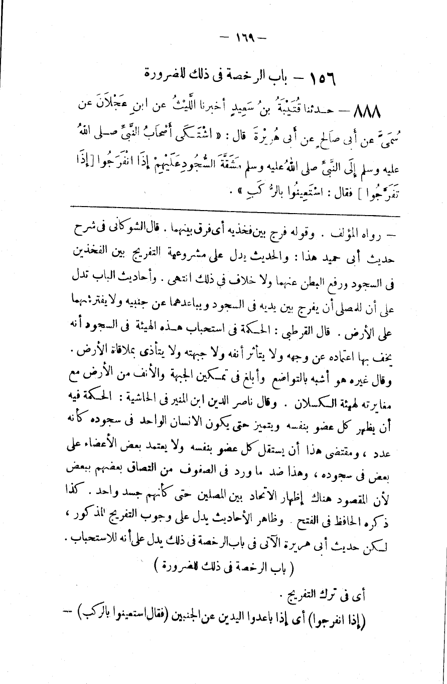 رَوَاهُ الْمُؤَلِّف . وَقَوْله فَرَّجَ بَيْن فَخِذَيْهِ أَيْ فَرَّقَ بَيْنهمَا . قَالَ الشَّوْكَانِيُّ حَدِيث أَبِي حُمَيْدٍ هَذَا : وَالْحَدِيث يَدُلّ عَلَى مَشْرُوعِيَّة التَّفْرِيج بَيْن الْفَخِذَيْنِ فِي السُّجُود وَرَفْع الْبَطْن عَنْهُمَا وَلَا خِلَاف فِي ذَلِكَ اِنْتَهَى . وَأَحَادِيث الْبَاب تَدُلّ عَلَى أَنَّ لِلْمُصَلِّي أَنْ يُفَرِّج بَيْن يَدَيْهِ فِي السُّجُود وَيُبَاعِدهُمَا عَنْ جَبِينه وَلَا يَفْتَرِشهُمَا عَلَى الْأَرْض . قَالَ الْقُرْطُبِيّ : الْحِكْمَة فِي اِسْتِحْبَاب هَذِهِ الْهَيْئَة فِي السُّجُود أَنَّهُ يَخِفّ بِهَا اِعْتِمَاده عَنْ وَجْهه وَلَا يَتَأَثَّر أَنْفه وَلَا جَبْهَته وَلَا يَتَأَذَّى بِمُلَاقَاةِ الْأَرْض . وَقَالَ غَيْره هُوَ أَشْبَهَ بِالتَّوَاضُعِ وَأَبْلَغ فِي تَمْكِين الْجَبْهَة وَالْأَنْف مِنْ الْأَرْض مَعَ مُغَايَرَته لِهَيْئَةِ الْكَسْلَان . وَقَالَ نَاصِر الدِّين بْن الْمُنَيِّر فِي الْحَاشِيَة : الْحِكْمَة فِيهِ أَنْ يَظْهَر كُلّ عُضْو بِنَفْسِهِ وَيَتَمَيَّز حَتَّى يَكُون الْإِنْسَان الْوَاحِد فِي سُجُوده كَأَنَّهُ عَدَد ، وَمُقْتَضَى هَذَا أَنْ يَسْتَقِلّ كُلّ عُضْو بِنَفْسِهِ وَلَا يَعْتَمِد بَعْض الْأَعْضَاء عَلَى بَعْض فِي سُجُوده ، وَهَذَا ضِدّ مَا وَرَدَ فِي الصُّفُوف مِنْ اِلْتِصَاق بَعْضهمْ بِبَعْضِ لِأَنَّ الْمَقْصُود هُنَاكَ إِظْهَار الِاتِّحَاد بَيْن الْمُصَلِّينَ حَتَّى كَأَنَّهُمْ جَسَد وَاحِد . كَذَا ذَكَرَهُ الْحَافِظ فِي الْفَتْح وَظَاهِر الْأَحَادِيث يَدُلّ عَلَى وُجُوب التَّفْرِيج الْمَذْكُور ، لَكِنْ حَدِيث أَبِي هُرَيْرَة الْآتِي فِي بَاب الرُّخْصَة فِي ذَلِكَ يَدُلّ عَلَى أَنَّهُ لِلِاسْتِحْبَابِ .