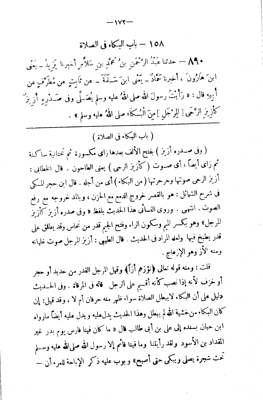 قُلْت : وَمِنْهُ قَوْله تَعَالَى { تَؤُزّهُمْ أَزًّا } وَقِيلَ الْمِرْجَل الْقِدْر مِنْ حَدِيد أَوْ حَجَر أَوْ خَزَف لِأَنَّهُ إِذَا نُصِبَ كَأَنَّهُ أُقِيمَ عَلَى الرِّجْل قَالَهُ فِي الْمِرْقَاة . وَفِي الْحَدِيث دَلِيل عَلَى أَنَّ الْبُكَاء لَا يُبْطِل الصَّلَاة سَوَاء ظَهَرَ مِنْهُ حَرْفَانِ أَمْ لَا ، وَقَدْ قِيلَ : إِنْ كَانَ الْبُكَاء مِنْ خَشْيَة اللَّه لَمْ يُبْطِل وَهَذَا الْحَدِيث يَدُلّ عَلَيْهِ وَيَدُلّ عَلَيْهِ أَيْضًا مَا رَوَاهُ اِبْن حِبَّان بِسَنَدِهِ إِلَى عَلِيّ بْن أَبِي طَالِب قَالَ " مَا كَانَ فِينَا فَارِس يَوْم بَدْر غَيْر الْمِقْدَاد بْن الْأَسْوَد وَلَقَدْ رَأَيْتنَا وَمَا فِينَا قَائِم إِلَّا رَسُول اللَّه صَلَّى اللَّه عَلَيْهِ وَسَلَّمَ تَحْت شَجَرَة يُصَلِّي وَيَبْكِي حَتَّى أَصْبَحَ " وَبَوَّبَ عَلَيْهِ ذِكْر الْإِبَاحَة لِلْمَرْءِ أَنْ @