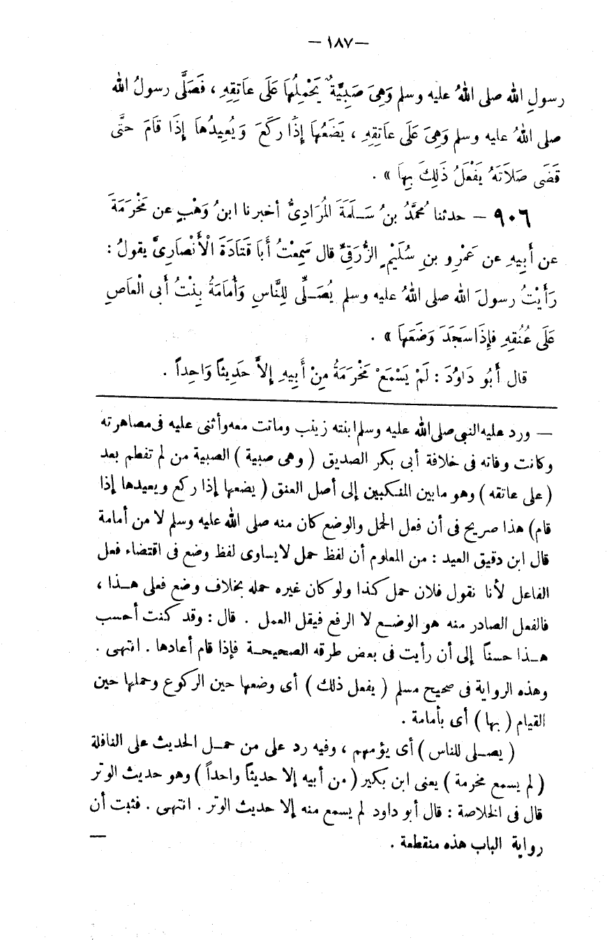 : هَذَا صَرِيح فِي أَنَّ فِعْل الْحَمْل وَالْوَضْع كَانَ مِنْهُ صَلَّى اللَّه عَلَيْهِ وَسَلَّمَ لَا مِنْ أُمَامَةَ قَالَ اِبْن دَقِيق الْعِيد : مِنْ الْمَعْلُوم أَنَّ لَفْظ حَمَلَ لَا يُسَاوِي لَفْظ وَضَعَ فِي اِقْتِضَاء فِعْل الْفَاعِل لِأَنَّا نَقُول فُلَان حَمَلَ كَذَا وَلَوْ كَانَ غَيْره حَمَلَهُ بِخِلَافِ وَضَعَ فَعَلَى هَذَا ، فَالْفِعْل الصَّادِر مِنْهُ هُوَ الْوَضْع لَا الرَّفْع فَيَقِلّ الْعَمَل . قَالَ : وَقَدْ كُنْت أَحْسَب هَذَا حَسَنًا إِلَى أَنْ رَأَيْت فِي بَعْض طُرُقه الصَّحِيحَة فَإِذَا قَامَ أَعَادَهَا . اِنْتَهَى . وَهَذِهِ الرِّوَايَة فِي صَحِيح مُسْلِم