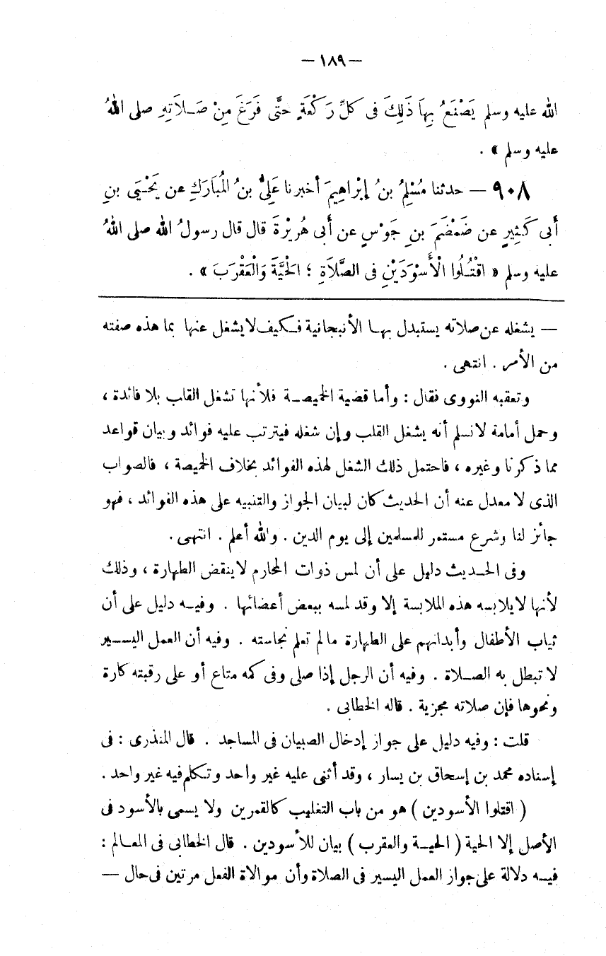 : بَيَان لِلْأَسْوَدَيْنِ . قَالَ الْخَطَّابِيُّ فِي الْمَعَالِم : فِيهِ دَلَالَة عَلَى جَوَاز الْعَمَل الْيَسِير فِي الصَّلَاة وَأَنَّ مُوَالَاة الْفِعْل مَرَّتَيْنِ فِي حَال @