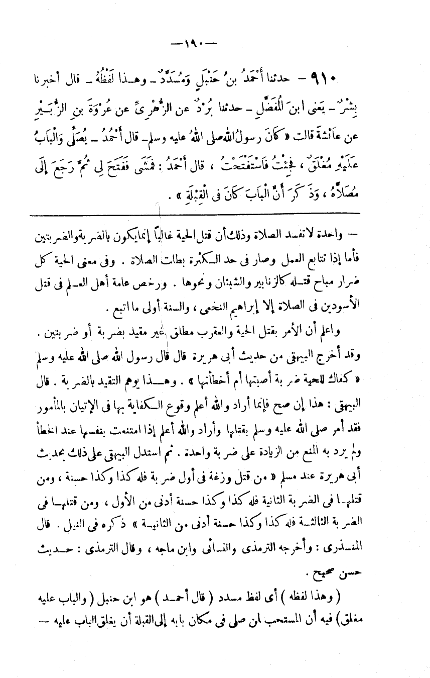 وَاعْلَمْ أَنَّ الْأَمْر بِقَتْلِ الْحَيَّة وَالْعَقْرَب مُطْلَق غَيْر مُقَيَّد بِضَرْبَةٍ أَوْ ضَرْبَتَيْنِ . وَقَدْ أَخْرَجَ الْبَيْهَقِيُّ مِنْ حَدِيث أَبِي هُرَيْرَة قَالَ قَالَ رَسُول اللَّه صَلَّى اللَّه عَلَيْهِ وَسَلَّمَ " كَفَاك لِلْحَيَّةِ ضَرْبَة أَصَبْتهَا أَمْ أَخْطَأْتهَا " وَهَذَا يُوهِم التَّقَيُّد بِالضَّرْبَةِ . قَالَ الْبَيْهَقِيُّ : هَذَا إِنْ صَحَّ فَإِنَّمَا أَرَادَ وَاَللَّه أَعْلَم وُقُوع الْكِفَايَة بِهَا فِي الْإِتْيَان بِالْمَأْمُورِ فَقَدْ أَمَرَ صَلَّى اللَّه عَلَيْهِ وَسَلَّمَ بِقَتْلِهَا وَأَرَادَ وَاَللَّه أَعْلَم إِذَا اِمْتَنَعَتْ بِنَفْسِهَا عِنْد الْخَطَأ وَلَمْ يُرِدْ بِهِ الْمَنْع مِنْ الزِّيَادَة عَلَى ضَرْبَة وَاحِدَة . ثُمَّ اِسْتَدَلَّ الْبَيْهَقِيُّ عَلَى ذَلِكَ بِحَدِيثِ أَبِي هُرَيْرَة عِنْد مُسْلِم " مَنْ قَتَلَ وَزَغَة فِي أَوَّل ضَرْبَة فَلَهُ كَذَا وَكَذَا حَسَنَة ، وَمَنْ قَتَلَهَا فِي الضَّرْبَة الثَّانِيَة فَلَهُ كَذَا وَكَذَا حَسَنَة أَدْنَى مِنْ الْأَوَّل " وَمَنْ قَتَلَهَا فِي الضَّرْبَة الثَّالِثَة فَلَهُ كَذَا وَكَذَا حَسَنَة أَدْنَى مِنْ الثَّانِيَة ذَكَرَهُ فِي النَّيْل .