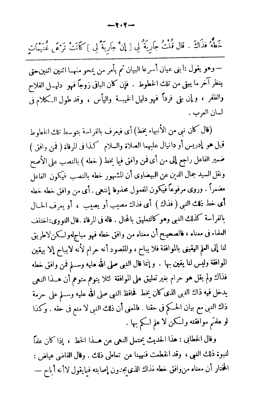 وَقَالَ الْخَطَّابِيُّ : هَذَا الْحَدِيث يَحْتَمِل النَّهْي عَنْ هَذَا الْخَطّ ، إِذَا كَانَ عَلَمًا لِنُبُوَّةِ ذَلِكَ النَّبِيّ ، وَقَدْ اِنْقَطَعَتْ فَنُهِينَا عَنْ تَعَاطِي ذَلِكَ ، قَالَ الْقَاضِي عِيَاض : الْمُخْتَار أَنَّ مَعْنَاهُ مَنْ وَافَقَ خَطّه فَذَاكَ الَّذِي يَجِدُونَ إِصَابَته فِيمَا يَقُول لَا أَنَّهُ أَبَاحَ@