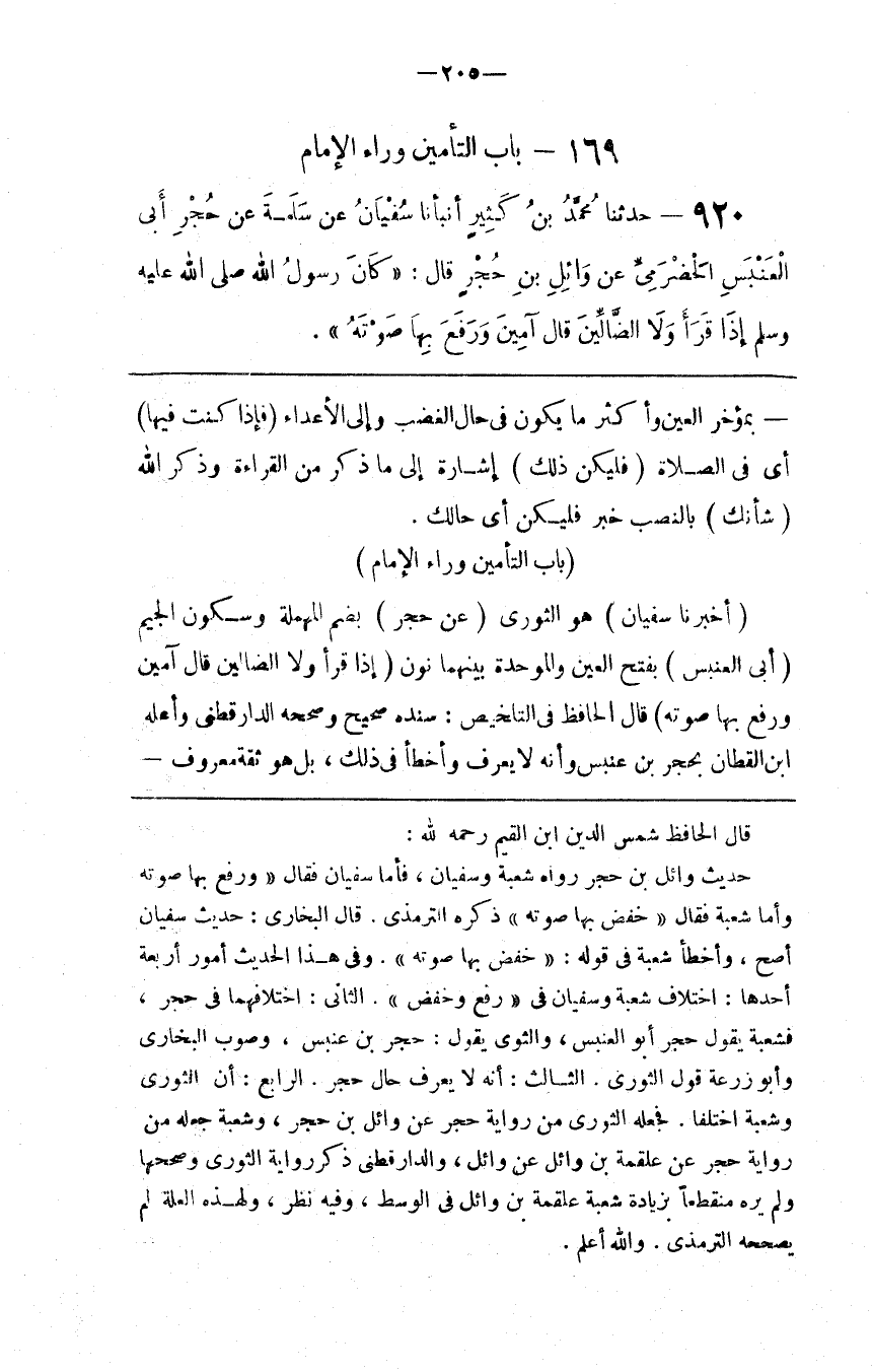 قال الحافظ شمس الدين ابن القيم رحمه الله حديث وائل بن حجر رواه شعبة وسفيان فأما سفيان فقال ورفع بها صوته وأما شعبة فقال خفض بها صوته ذكره الترمذي