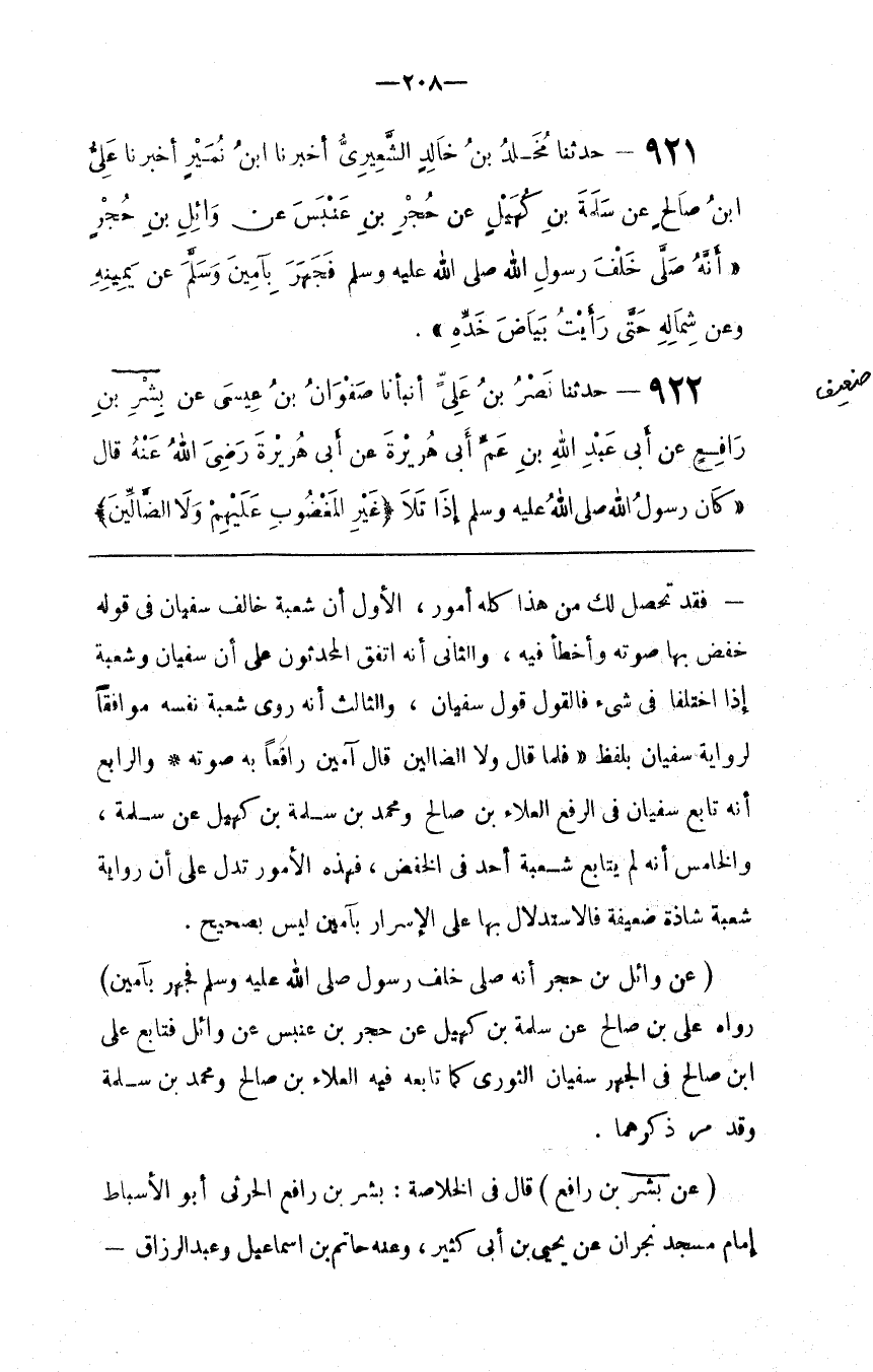 حَدِيث وَائِلِ بْنِ حُجْرٍ رَوَاهُ شُعْبَةُ وَسُفْيَانُ ، فَأَمَّا سُفْيَانُ فَقَالَ " وَرَفَعَ بِهَا صَوْته وَأَمَّا شُعْبَةُ فَقَالَ " خَفَضَ بِهَا صَوْته " ذَكَرَهُ التِّرْمِذِيُّ . قَالَ الْبُخَارِيُّ : حَدِيثُ سُفْيَانَ أَصَحّ ، وَأَخْطَأَ شُعْبَةُ فِي قَوْله : " خَفَضَ بِهَا صَوْته " . وَفِي هَذَا الْحَدِيث أُمُور أَرْبَعَة أَحَدهَا : اِخْتِلَاف شُعْبَةَ وَسُفْيَانَ فِي " رَفَعَ وَخَفَضَ " . الثَّانِي : اِخْتِلَافهمَا فِي حُجْرٍ ، فَشُعْبَةُ يَقُول حُجْرٌ أَبُو الْعَنْبَسِ ، وَالثَّوْرِيُّ يَقُول : حُجْرُ بْنُ عَبْسٍ ، وَصَوَّبَ الْبُخَارِيُّ وَأَبُو زُرْعَةَ قَوْل الثَّوْرِيِّ . الثَّالِث : أَنَّهُ لَا يُعْرَف حَال حُجْرٍ . الرَّابِع : أَنَّ الثَّوْرِيَّ وَشُعْبَةَ اِخْتَلَفَا . فَجَعَلَهُ الثَّوْرِيُّ مِنْ رِوَايَة حُجْرٍ عَنْ وَائِلِ بْنِ حُجْرٍ ، وَشُعْبَةُ جَعَلَهُ مِنْ رِوَايَة حُجْرٍ عَنْ عَلْقَمَةَ بْنِ وَائِلٍ عَنْ وَائِلٍ ، وَالدَّارَقُطْنِيّ ذَكَرَ رِوَايَة الثَّوْرِيِّ وَصَحَّحَهَا وَلَمْ يَرَهُ مُنْقَطِعًا بِزِيَادَةِ شُعْبَةَ عَلْقَمَةَ بْنَ وَائِلٍ فِي الْوَسَط ، وَفِيهِ نَظَرٌ ، وَلِهَذِهِ الْعِلَّة لَمْ يُصَحِّحهُ التِّرْمِذِيُّ . وَاللَّهُ أَعْلَم .
