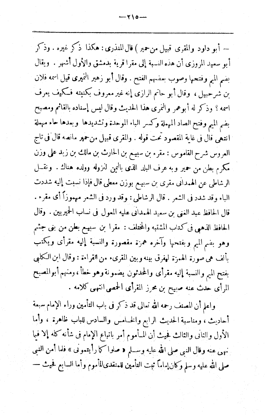 : قَالَ الْمُنْذِرِيُّ : هَكَذَا ذَكَرَ غَيْره . وَذَكَرَ أَبُو سَعِيد الْمَرْوَزِيُّ أَنَّ هَذِهِ النِّسْبَة إِلَى مَقْرَا قَرْيَة بِدِمَشْق وَالْأَوَّل أَشْهَر . وَيُقَال بِضَمِّ الْمِيم وَفَتْحهَا وَصَوَّبَ بَعْضهمْ الْفَتْح . وَقَالَ أَبُو زُهَيْر النُّمَيْرِيّ قِيلَ اِسْمه فُلَان بْن شُرَحْبِيل ، وَقَالَ أَبُو حَاتِم الرَّازِيُّ إِنَّهُ غَيْر مَعْرُوف بِكُنْيَتِهِ فَكَيْف يُعْرَف اِسْمه ؟ وَذَكَرَ لَهُ أَبُو عُمَر وَالنَّمَرِيّ هَذَا الْحَدِيث وَقَالَ لَيْسَ إِسْنَاده بِالْقَائِمِ وَمُصَبِّح بِضَمِّ الْمِيم وَفَتْح الصَّاد الْمُهْمَلَة وَكَسْر الْبَاء الْمُوَحَّدَة وَتَشْدِيدهَا وَبَعْدهَا حَاء مُهْمَلَة اِنْتَهَى قَالَ فِي غَايَة الْمَقْصُود تَحْت قَوْله . وَالْمُقْرِي قَبِيل مِنْ حِمْيَر مَا نَصّه قَالَ فِي تَاج الْعَرُوس شَرْح الْقَامُوس : مُقْرِء بْن سَبِيع بْن الْحَارِث بْن مَالِك بْن زَيْد عَلَى وَزْن مُكْرِم بَطْن مِنْ حِمْيَر وَبِهِ عُرِفَ الْبَلَد الَّذِي بِالْيَمَنِ لِنُزُولِهِ وَوَلَده هُنَاكَ . وَنَقَلَ الرَّشَاطِيّ عَنْ الْهَمْدَانِيِّ مُقْرِي بْن سَبِيع بِوَزْنِ مُعْطِي قَالَ فَإِذَا نَسَبْت إِلَيْهِ شَدَّدْت الْبَاء وَقَدْ شُدِّدَ فِي الشِّعْر . قَالَ الرَّشَاطِيّ : وَقَدْ وَرَدَ فِي الشِّعْر مَهْمُوزًا أَيْ مُقْرِء . قَالَ الْحَافِظ عَبْد الْغَنِيّ بْن سَعِيد الْهَمْدَانِيُّ عَلَيْهِ الْمُعَوَّل فِي نِسَاب الْحِمْيَرِيِّينَ وَقَالَ الْحَافِظ الذَّهَبِيّ فِي كِتَاب الْمُشْتَبِه وَالْمُخْتَلِف : مُقْرَا بْن سَبِيع بَطْن مِنْ بَنِي جُشَم وَهُوَ بِضَمِّ الْمِيم وَبِفَتْحِهَا وَآخِره هَمْزَة مَقْصُورَة وَالنِّسْبَة إِلَيْهِ مَقْرَئِيّ وَيُكْتَب بِأَلِفٍ هِيَ صُورَة الْهَمْزَة لِيُفَرَّق بَيْنه وَبَيْن الْمُقْرِئ مِنْ الْقِرَاءَة : وَقَالَ اِبْن الْكَلْبِيّ بِفَتْحِ الْمِيم وَالنِّسْبَة إِلَيْهِ مَقْرَئِيّ وَالْمُحَدِّثُونَ يَضُمُّونَهُ وَهُوَ خَطَأ ، وَمِنْهُمْ أَبُو الْمُصَبِّح المرأي حَدَّثَ عَنْهُ صُبَيْح بْن مُحْرِز الْمَقْرَئِيّ الْحِمْصِيّ اِنْتَهَى كَلَامه .
