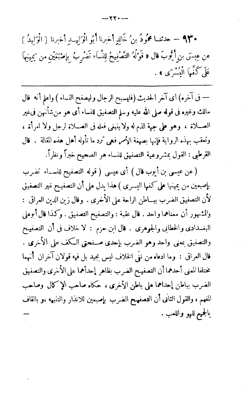 : هَذَا يَدُلّ عَلَى أَنَّ التَّصْفِيح غَيْر التَّصْفِيق لِأَنَّ التَّصْفِيق الضَّرْب بِبَاطِنِ الرَّاحَة عَلَى الْأُخْرَى . قَالَ زَيْن الدِّين الْعِرَاقِيّ : وَالْمَشْهُور أَنَّ مَعْنَاهَا وَاحِد . قَالَ عُقْبَة : وَالتَّصْفِيح التَّصْفِيق . وَكَذَا قَالَ أَبُو عَلِيّ الْبَغْدَادِيّ وَالْخَطَّابِيّ وَالْجَوْهَرِيّ . قَالَ اِبْن حَزْم : لَا خِلَاف فِي أَنَّ التَّصْفِيح وَالتَّصْفِيق بِمَعْنًى وَاحِد وَهُوَ الضَّرْب بِإِحْدَى صَفْحَتَيْ الْكَفّ عَلَى الْأُخْرَى قَالَ الْعِرَاقِيّ : وَمَا اِدَّعَاهُ مِنْ نَفْي الْخِلَاف لَيْسَ بِجَيِّدٍ بَلْ فِيهِ قَوْلَانِ آخَرَانِ أَنَّهُمَا مُخْتَلِفَا الْمَعْنَى أَحَدهمَا أَنَّ التَّصْفِيح الضَّرْب بِظَاهِرِ إِحْدَاهُمَا عَلَى الْأُخْرَى وَالتَّصْفِيق الضَّرْب بِبَاطِنِ إِحْدَاهُمَا عَلَى بَاطِن الْأُخْرَى ، حَكَاهُ صَاحِب الْإِكْمَال وَصَاحِب الْمُفْهِم ، وَالْقَوْل الثَّانِي إنَّ التَّصْفِيح الضَّرْب بِإِصْبَعَيْنِ لِلْإِنْذَارِ وَالتَّنْبِيه ، وَبِالْقَافِ بِالْجَمِيعِ لِلَّهْوِ وَاللَّعِب .@