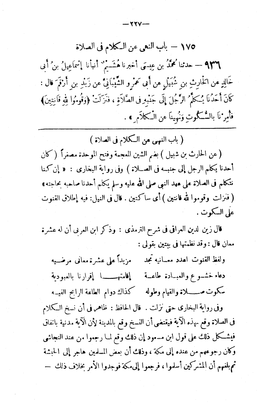 قَالَ زَيْن الدِّين الْعِرَاقِيّ فِي شَرْح التِّرْمِذِيّ : وَذَكَرَ اِبْن الْعَرَبِيّ أَنَّ لَهُ عَشَرَة مَعَانٍ قَالَ : وَقَدْ نَظَمْتهَا فِي بَيْتَيْنِ بِقَوْلِي : وَلَفْظ الْقُنُوت اُعْدُدْ مَعَانِيه تَجِد مَزِيدًا عَلَى عَشَرَة مَعَانِي مُرْضِيَه دُعَاء خُشُوع وَالْعِبَادَة طَاعَة إِقَامَتهَا إِقْرَارنَا بِالْعُبُودِيَّهْ سُكُوت صَلَاة وَالْقِيَام وَطُوله كَذَاك دَوَام الطَّاعَة الرَّابِح اِلْفِيه وَفِي رِوَايَة الْبُخَارِيّ حَتَّى نَزَلَتْ . قَالَ الْحَافِظ : ظَاهِر فِي أَنَّ نَسْخ الْكَلَام فِي الصَّلَاة وَقَعَ بِهَذِهِ الْآيَة فَيَقْتَضِي أَنَّ النَّسْخ وَقَعَ بِالْمَدِينَةِ لِأَنَّ الْآيَة مَدَنِيَّة بِاتِّفَاقٍ فَيُشْكِل ذَلِكَ عَلَى قَوْل اِبْن مَسْعُود إِنَّ ذَلِكَ وَقَعَ لَمَّا رَجَعُوا مِنْ عِنْد النَّجَاشِيّ وَكَانَ رُجُوعهمْ مِنْ عِنْده إِلَى مَكَّة ، وَذَلِكَ أَنَّ بَعْض الْمُسْلِمِينَ هَاجَرَ إِلَى الْحَبَشَة ثُمَّ بَلَغَهُمْ أَنَّ الْمُشْرِكِينَ أَسْلَمُوا ، فَرَجَعُوا إِلَى مَكَّة فَوَجَدُوا الْأَمْر بِخِلَافِ ذَلِكَ@