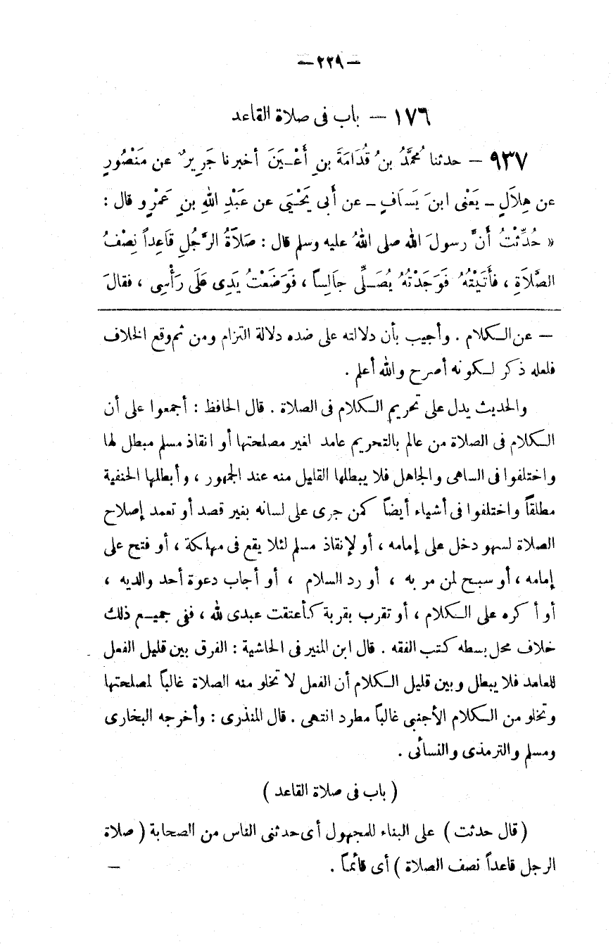 وَالْحَدِيث يَدُلّ عَلَى تَحْرِيم الْكَلَام فِي الصَّلَاة . قَالَ الْحَافِظ : أَجْمَعُوا عَلَى أَنَّ الْكَلَام فِي الصَّلَاة مِنْ عَالِم بِالتَّحْرِيمِ عَامِد لِغَيْرِ مَصْلَحَتهَا أَوْ إِنْقَاذ مُسْلِم مُبْطِل لَهَا وَاخْتَلَفُوا فِي السَّاهِي وَالْجَاهِل فَلَا يُبْطِلهَا الْقَلِيل مِنْهُ عِنْد الْجُمْهُور ، وَأَبْطَلَهَا الْحَنَفِيَّة مُطْلَقًا وَاخْتَلَفُوا فِي أَشْيَاء أَيْضًا كَمَنْ جَرَى عَلَى لِسَانه بِغَيْرِ قَصْد أَوْ تَعَمُّد إِصْلَاح الصَّلَاة لِسَهْوٍ دَخَلَ عَلَى إِمَامه ، أَوْ لِإِنْقَاذِ مُسْلِم لِئَلَّا يَقَع فِي مَهْلَكَة ، أَوْ فَتَحَ عَلَى إِمَامه ، أَوْ سَبَّحَ لِمَنْ مَرَّ بِهِ ، أَوْ رَدَّ السَّلَام ، أَوْ أَجَابَ دَعْوَة أَحَد وَالِدَيْهِ ، أَوْ أُكْرِهَ عَلَى الْكَلَام ، أَوْ تَقَرَّبَ بِقُرْبَةٍ كَأَعْتَقْت عَبْدِي لِلَّهِ ، فَفِي جَمِيع ذَلِكَ خِلَاف مَحَلّ بَسْطه كُتُب الْفِقْه . قَالَ اِبْن الْمُنَيِّر فِي الْحَاشِيَة : الْفَرْق بَيْن قَلِيل الْفِعْل لِلْعَامِدِ فَلَا يُبْطِل وَبَيْن قَلِيل الْكَلَام أَنَّ الْفِعْل لَا تَخْلُو مِنْهُ الصَّلَاة غَالِبًا لِمَصْلَحَتِهَا وَتَخْلُو مِنْ الْكَلَام الْأَجْنَبِيّ غَالِبًا مُطَّرِد اِنْتَهَى .
