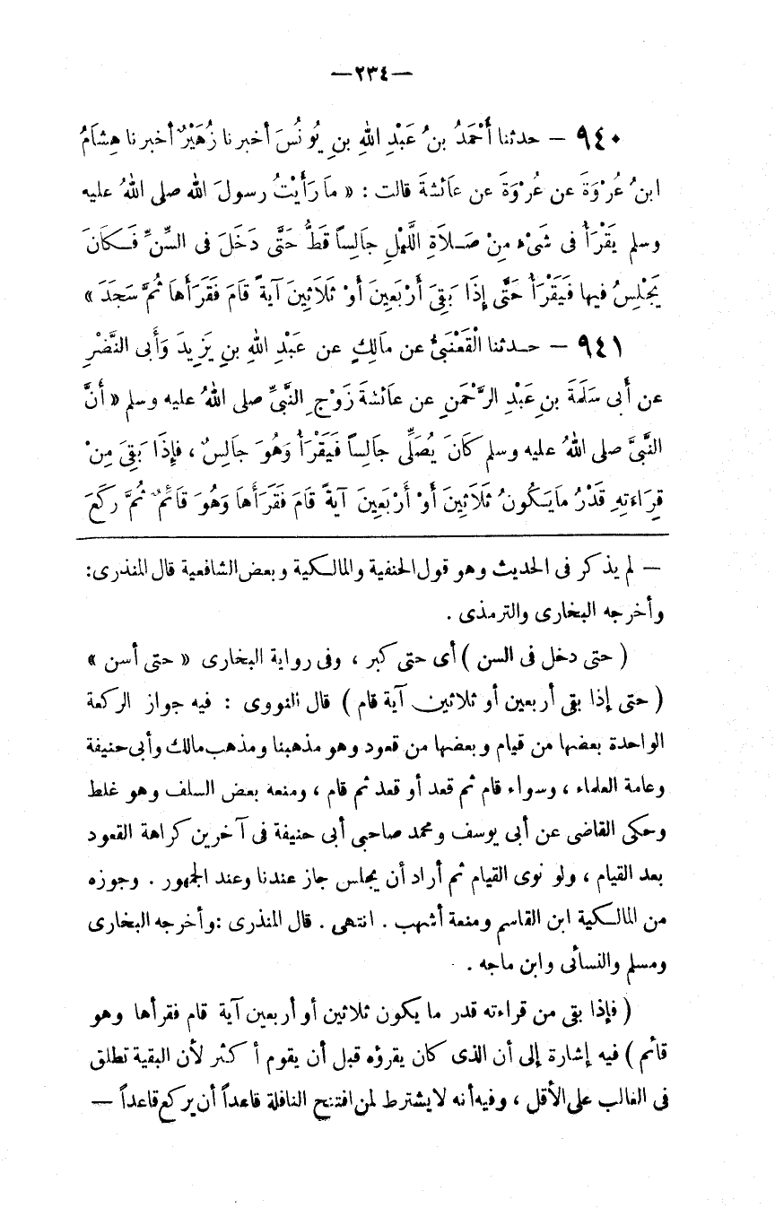: قَالَ النَّوَوِيّ : فِيهِ جَوَاز الرَّكْعَة الْوَاحِدَة بَعْضهَا مِنْ قِيَام وَبَعْضهَا مِنْ قُعُود وَهُوَ مَذْهَبنَا وَمَذْهَب مَالِك وَأَبِي حَنِيفَة وَعَامَّة الْعُلَمَاء ، وَسَوَاء قَامَ ثُمَّ قَعَدَ أَوْ قَعَدَ ثُمَّ قَامَ ، وَمَنَعَهُ بَعْض السَّلَف وَهُوَ غَلَط وَحَكَى الْقَاضِي عَنْ أَبِي يُوسُف وَمُحَمَّد صَاحِبَيْ أَبِي حَنِيفَة فِي آخَرِينَ كَرَاهَة الْقُعُود بَعْد الْقِيَام ، وَلَوْ نَرَى الْقِيَام ثُمَّ أَرَادَ أَنْ يَجْلِس جَازَ عِنْدنَا وَعِنْد الْجُمْهُور . وَجَوَّزَهُ مِنْ الْمَالِكِيَّة اِبْن الْقَاسِم وَمَنَعَهُ أَشْهَب . اِنْتَهَى . قَالَ الْمُنْذِرِيُّ : وَأَخْرَجَهُ الْبُخَارِيّ وَمُسْلِم وَالنَّسَائِيُّ وَابْن مَاجَهْ .