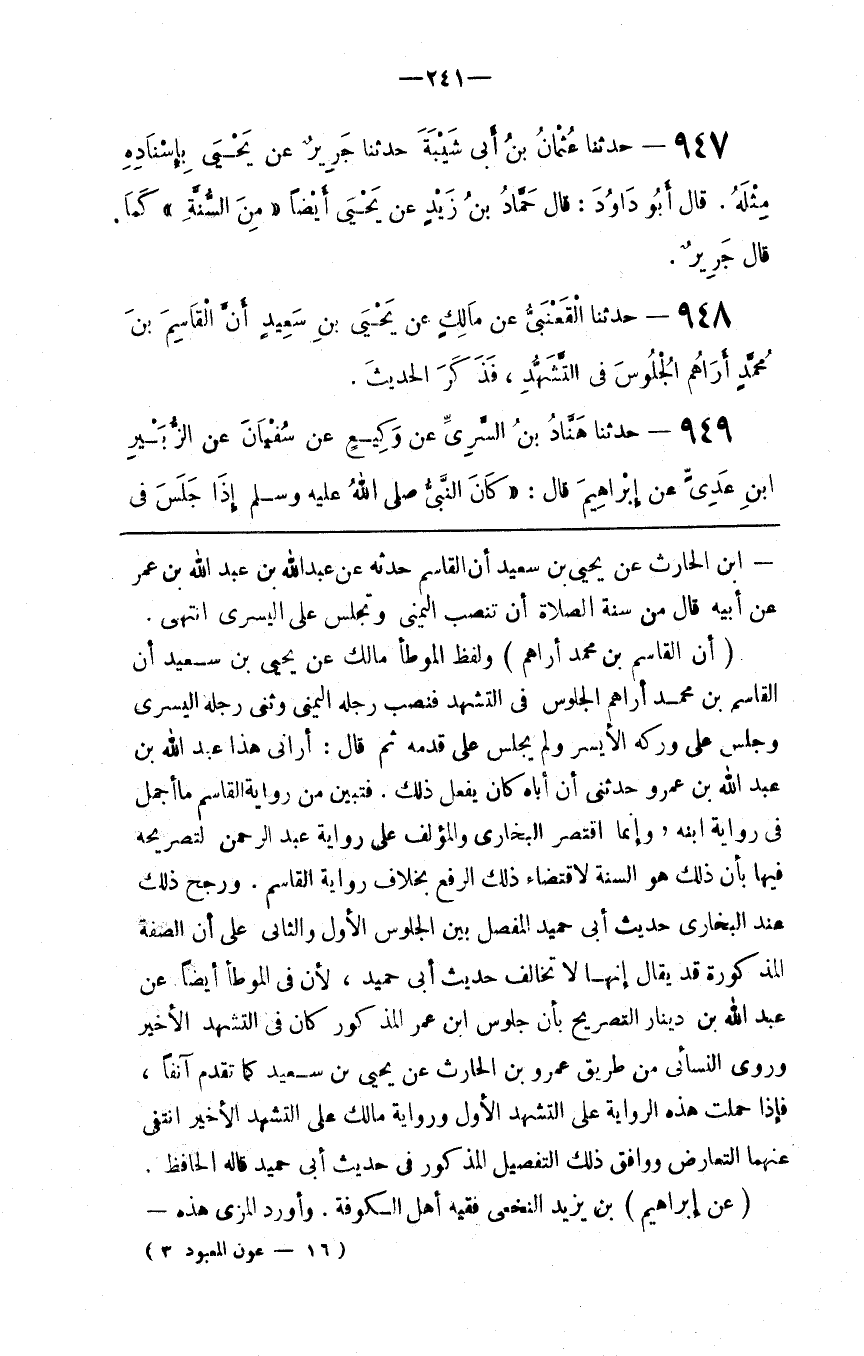 بْن الْحَارِث عَنْ يَحْيَى بْن سَعِيد أَنَّ الْقَاسِم حَدَّثَهُ عَنْ عَبْد اللَّه بْن عَبْد اللَّه بْن عُمَر عَنْ أَبِيهِ قَالَ مِنْ سُنَّة الصَّلَاة أَنْ تَنْصِب الْيُمْنَى وَتَجْلِس عَلَى الْيُسْرَى اِنْتَهَى .