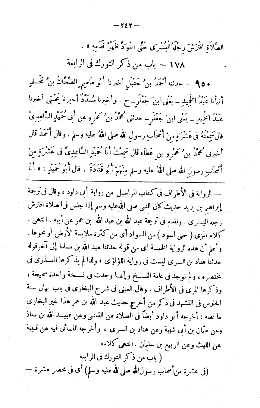 الرِّوَايَة فِي الْأَطْرَاف فِي كِتَاب الْمَرَاسِيل مِنْ رِوَايَة أَبِي دَاوُدَ ، وَقَالَ فِي تَرْجَمَة إِبْرَاهِيم بْن يَزِيد حَدِيث كَانَ النَّبِيّ صَلَّى اللَّه عَلَيْهِ وَسَلَّمَ إِذَا جَلَسَ فِي الصَّلَاة اِفْتَرَشَ رِجْله الْيُسْرَى . وَتَقَدَّمَ فِي تَرْجَمَة عَبْد اللَّه بْن عَبْد اللَّه بْن عُمَر عَنْ أَبِيهِ . اِنْتَهَى كَلَام الْمِزِّيّ