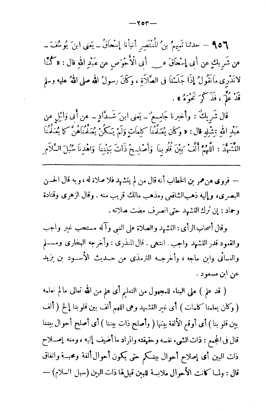 فَرُوِيَ عَنْ عُمَر بْن الْخَطَّاب أَنَّهُ قَالَ مَنْ لَمْ يَتَشَهَّد فَلَا صَلَاة لَهُ ، وَبِهِ قَالَ الْحَسَن الْبَصْرِيّ ، وَإِلَيْهِ ذَهَبَ الشَّافِعِيّ وَمَذْهَب مَالِك قَرِيبٌ مِنْهُ . وَقَالَ الزُّهْرِيّ وَقَتَادَة وَحَمَّاد : إِنْ تَرَكَ التَّشَهُّد حَتَّى اِنْصَرَفَ مَضَتْ صَلَاته . وَقَالَ أَصْحَاب الرَّأْي : التَّشَهُّد وَالصَّلَاة عَلَى النَّبِيّ وَآلِهِ مُسْتَحَبّ غَيْر وَاجِب وَالْقُعُود قَدْر التَّشَهُّد وَاجِبٌ . اِنْتَهَى .