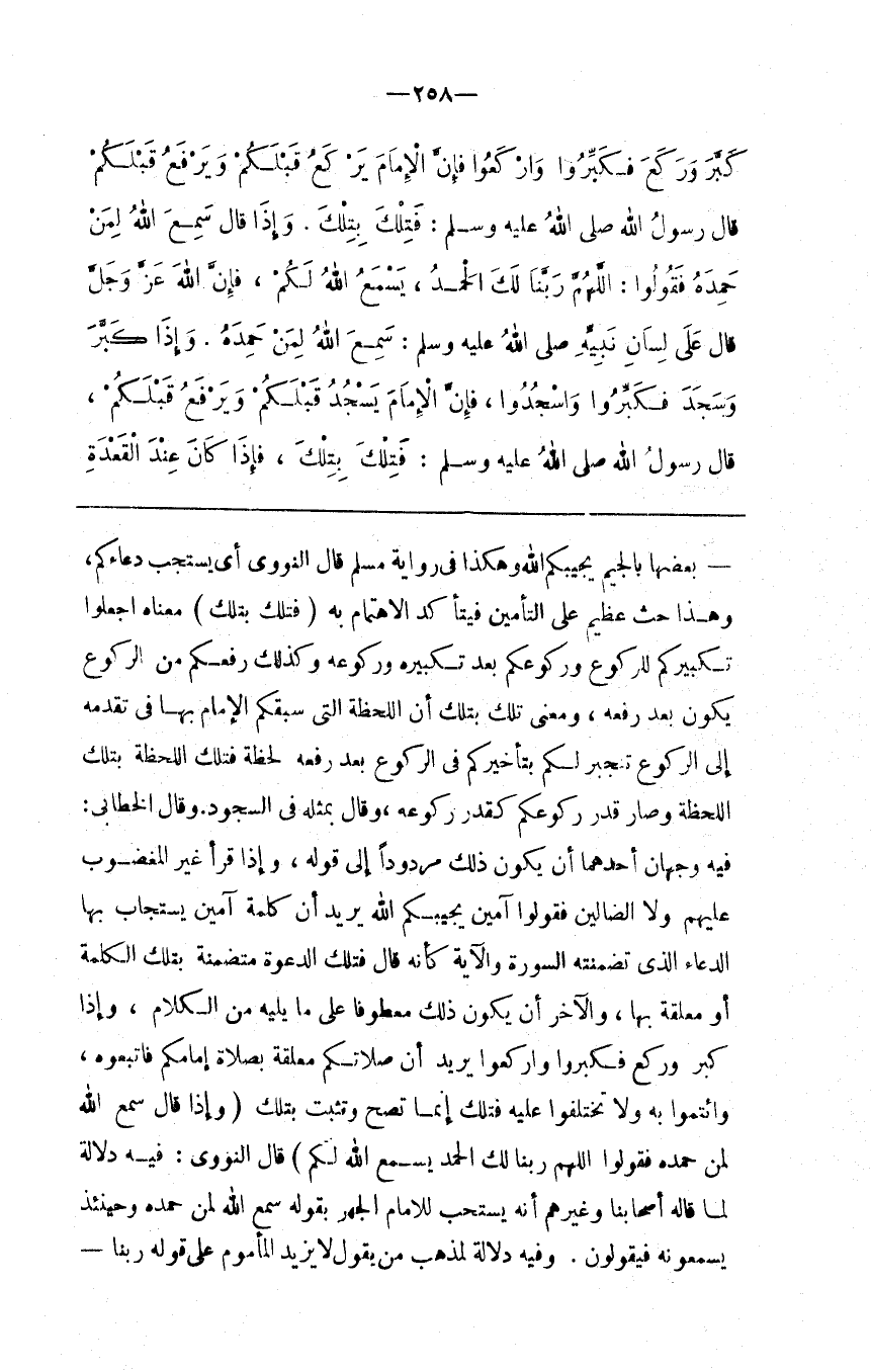 : مَعْنَاهُ اِجْعَلُوا تَكْبِيركُم لِلرُّكُوعِ وَرُكُوعكُمْ بَعْد تَكْبِيره وَرُكُوعه وَكَذَلِكَ رَفْعكُمْ مِنْ الرُّكُوع يَكُون بَعْد رَفْعه ، وَمَعْنَى تِلْكَ بِتِلْكَ أَنَّ اللَّحْظَة الَّتِي سَبَقَكُمْ الْإِمَام بِهَا فِي تَقَدُّمه إِلَى الرُّكُوع تُجْبَر لَكُمْ بِتَأْخِيرِكُمْ فِي الرُّكُوع بَعْد رَفْعه لَحْظَة فَتِلْكَ اللَّحْظَة وَصَارَ قَدْر رُكُوعكُمْ كَقَدْرِ رُكُوعه ، وَقَالَ بِمِثْلِهِ فِي السُّجُود . وَقَالَ الْخَطَّابِيُّ : فِيهِ وَجْهَانِ أَحَدهمَا أَنْ يَكُون ذَلِكَ مَرْدُودًا إِلَى قَوْله ، وَإِذَا قَرَأَ غَيْر الْمَغْضُوب عَلَيْهِمْ وَلَا الضَّالِّينَ فَقُولُوا آمِينَ يُجِيبكُمْ اللَّه يُرِيد أَنَّ كَلِمَة آمِينَ يُسْتَجَاب بِهَا الدُّعَاء الَّذِي تَضَمَّنَتْهُ الصُّورَة وَالْآيَة كَأَنَّهُ قَالَ فَتِلْكَ الدَّعْوَة مُتَضَمَّنَة بِتِلْكَ الْكَلِمَة أَوْ مُعَلَّقَة بِهَا ، وَالْآخَر أَنْ يَكُون ذَلِكَ مَعْطُوفًا عَلَى مَا يَلِيه مِنْ الْكَلَام ، وَإِذَا كَبَّرَ وَرَكَعَ فَكَبِّرُوا وَارْكَعُوا يُرِيد أَنَّ صَلَاتكُمْ مُعَلَّقَة بِصَلَاةِ إِمَامكُمْ فَاتَّبِعُوهُ ، وَائْتَمُّوا بِهِ وَلَا تَخْتَلِفُوا عَلَيْهِ إِنَّمَا تَصِحّ وَتَثْبُتُ بِتِلْكَ