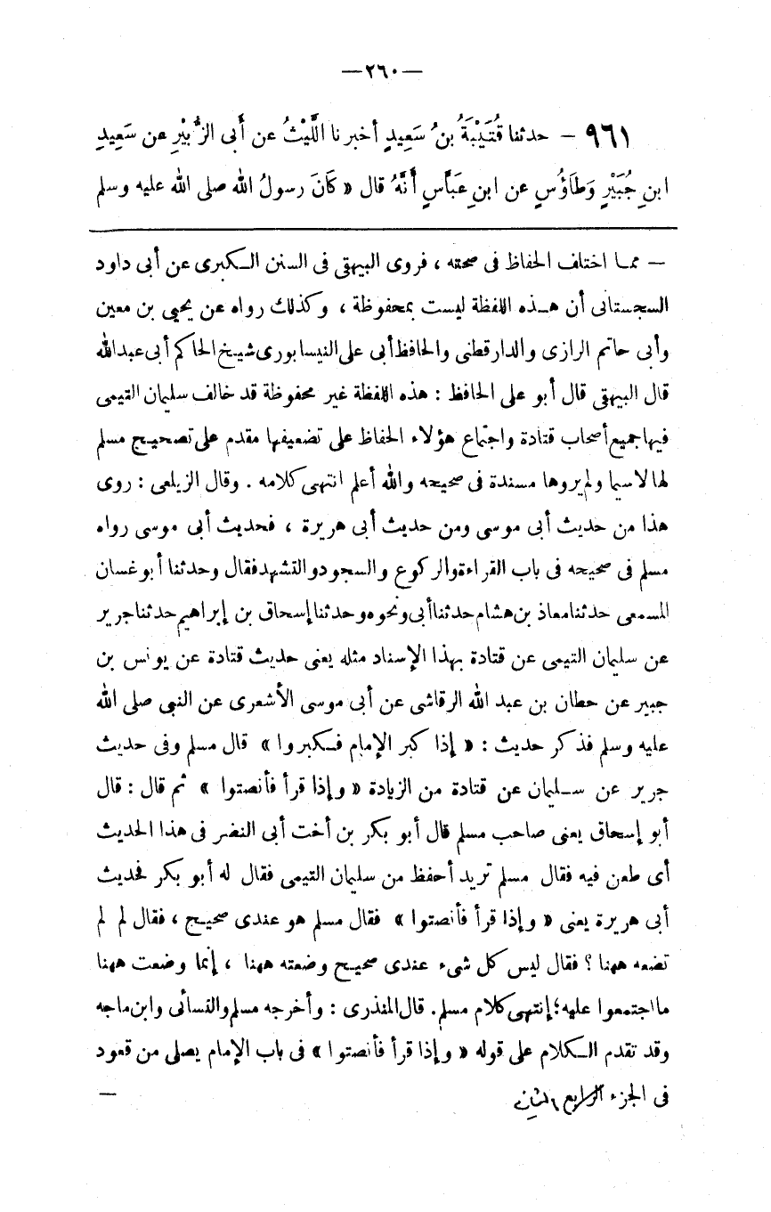 مِمَّا اِخْتَلَفَ الْحُفَّاظ فِي صِحَّته ، فَرَوَى الْبَيْهَقِيُّ فِي السُّنَن الْكُبْرَى عَنْ أَبِي دَاوُدَ السَّجِسْتَانِيّ أَنَّ هَذِهِ اللَّفْظَة لَيْسَتْ بِمَحْفُوظَةٍ ، وَكَذَلِكَ رَوَاهُ يَحْيَى بْن مَعِين وَأَبُو حَاتِم الرَّازِيّ وَالدَّارَقُطْنِيّ وَالْحَافِظ أَبُو عَلِيّ النَّيْسَابُورِيّ شَيْخ الْحَاكِم أَبِي عَبْد اللَّه قَالَ الْبَيْهَقِيُّ قَالَ أَبُو عَلِيّ الْحَافِظ : هَذِهِ اللَّفْظَة غَيْر مَحْفُوظَة قَدْ خَالَفَ سُلَيْمَان التَّيْمِيُّ فِيهَا جَمِيع أَصْحَاب قَتَادَةَ وَاجْتِمَاع هَؤُلَاءِ الْحُفَّاظ عَلَى تَضْعِيفهَا مُقَدَّم عَلَى تَصْحِيح مُسْلِم لَهَا لَا سِيَّمَا وَلَمْ يَرْوِهَا مُسْنَدَة فِي صَحِيحه وَاللَّهُ أَعْلَم اِنْتَهَى كَلَامه . وَقَالَ الزَّيْلَعِيُّ : رُوِيَ هَذَا مِنْ حَدِيث أَبِي مُوسَى وَمِنْ حَدِيث أَبِي هُرَيْرَة ، فَحَدِيث أَبِي مُوسَى رَوَاهُ مُسْلِم فِي صَحِيحه فِي بَاب الْقِرَاءَة وَالرُّكُوع وَالسُّجُود وَالتَّشَهُّد فَقَالَ وَحَدَّثَنَا أَبُو غَسَّان الْمَسْمَعِيّ حَدَّثَنَا مُعَاذ بْن هِشَام حَدَّثَنَا أَبِي وَنَحْوه وَحَدَّثَنَا إِسْحَاق بْن إِبْرَاهِيم حَدَّثَنَا جَرِير عَنْ سُلَيْمَان التَّيْمِيِّ عَنْ قَتَادَةَ بِهَذَا الْإِسْنَاد مِثْله يَعْنِي حَدِيث قَتَادَةَ عَنْ يُونُس بْن جُبَيْر عَنْ حِطَّان بْن عَبْد اللَّه الرَّقَاشِيّ عَنْ أَبِي مُوسَى الْأَشْعَرِيّ عَنْ النَّبِيّ صَلَّى اللَّه عَلَيْهِ وَسَلَّمَ فَذَكَرَ حَدِيث : " إِذَا كَبَّرَ الْإِمَام فَكَبِّرُوا " قَالَ مُسْلِم وَفِي حَدِيث جَرِير عَنْ سُلَيْمَان عَنْ قَتَادَةَ مِنْ الزِّيَادَة " وَإِذَا قَرَأَ فَأَنْصِتُوا " ثُمَّ قَالَ : قَالَ أَبُو إِسْحَاق يَعْنِي صَاحِب مُسْلِم قَالَ أَبُو بَكْر بْن أُخْت أَبِي النَّضْر فِي هَذَا الْحَدِيث أَيْ طَعَنَ فِيهِ فَقَالَ مُسْلِم تُرِيد أَحْفَظ مِنْ سُلَيْمَان التَّيْمِيِّ فَقَالَ لَهُ أَبُو بَكْر فَحَدِيث أَبِي هُرَيْرَة يَعْنِي " وَإِذَا قَرَأَ فَأَنْصِتُوا " فَقَالَ مُسْلِم هُوَ عِنْدِي صَحِيح ، فَقَالَ لِمَ تَضَعهُ هَاهُنَا ؟ فَقَالَ لَيْسَ كُلّ شَيْء عِنْدِي صَحِيح وَضَعْته هَاهُنَا ، إِنَّمَا وَضَعْت هَاهُنَا مَا اِجْتَمَعُوا عَلَيْهِ ؛ اِنْتَهَى كَلَام مُسْلِم ، قَالَ الْمُنْذِرِيُّ : وَأَخْرَجَهُ مُسْلِم وَالنَّسَائِيُّ وَابْن مَاجَهْ وَقَدْ تَقَدَّمَ الْكَلَام عَلَى قَوْله " وَإِذَا قَرَأَ فَأَنْصِتُوا " فِي بَاب الْإِمَام يُصَلِّي مِنْ قُعُود فِي الْجُزْء الثاني .@