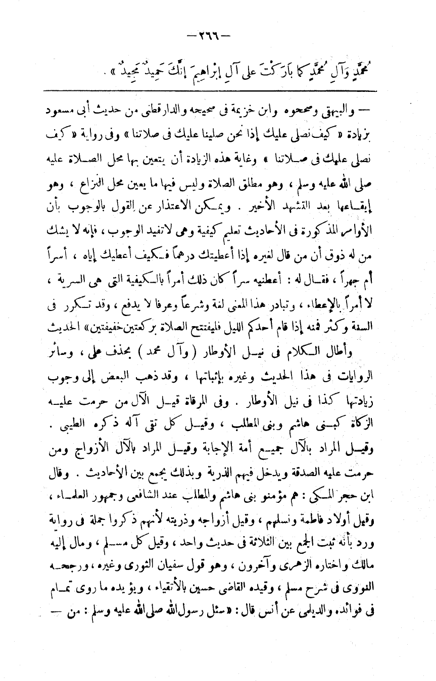 : بِحَذْفِ عَلَى ، وَسَائِر الرِّوَايَات فِي هَذَا الْحَدِيث وَغَيْره بِإِثْبَاتِهَا ، وَقَدْ ذَهَبَ الْبَعْض إِلَى وُجُوب زِيَادَتهَا كَذَا فِي نَيْل الْأَوْطَار . وَفِي الْمِرْقَاة قِيلَ الْآلُ مَنْ حَرُمَتْ عَلَيْهِ الزَّكَاة كَبَنِي هَاشِم وَبَنِي الْمُطَّلِب ، وَقِيلَ كُلّ تَقِيّ آلُهُ ذَكَرَهُ الطِّيبِيُّ . وَقِيلَ الْمُرَاد بِالْآلِ جَمِيع أُمَّة الْإِجَابَة وَقِيلَ الْمُرَاد بِالْآلِ الْأَزْوَاج وَمَنْ حَرُمَتْ عَلَيْهِ الصَّدَقَة وَيَدْخُل فِيهِمْ الذُّرِّيَّة وَبِذَلِكَ يُجْمَع بَيْن الْأَحَادِيث . وَقَالَ اِبْن حَجَر الْمَكِّيّ : هُمْ مُؤْمِنُو بَنِي هَاشِم وَالْمُطَّلِب عِنْد الشَّافِعِيّ وَجُمْهُور الْعُلَمَاء ، وَقِيلَ أَوْلَاد فَاطِمَة وَنَسْلهمْ ، وَقِيلَ أَزْوَاجه وَذُرِّيَّته لِأَنَّهُمْ ذُكِرُوا جُمْلَة فِي رِوَايَة وَرُدَّ بِأَنَّهُ ثَبَتَ الْجَمْع بَيْن الثَّلَاثَة فِي حَدِيث وَاحِد ، وَقِيلَ كُلّ مُسْلِم ، وَمَالَ إِلَيْهِ مَالِك وَاخْتَارَهُ الزُّهْرِيّ وَآخَرُونَ ، وَهُوَ قَوْل سُفْيَان الثَّوْرِيّ وَغَيْره ، وَرَجَّحَهُ النَّوَوِيّ فِي شَرْح مُسْلِم ، وَقَيَّدَهُ الْقَاضِي حُسَيْن بِالْأَتْقِيَاءِ ، وَيُؤَيِّدهُ مَا رَوَى تَمَام فِي فَوَائِده وَالدَّيْلَمِيّ عَنْ أَنَس قَالَ : " سُئِلَ رَسُول اللَّه صَلَّى اللَّه عَلَيْهِ وَسَلَّمَ : مَنْ@