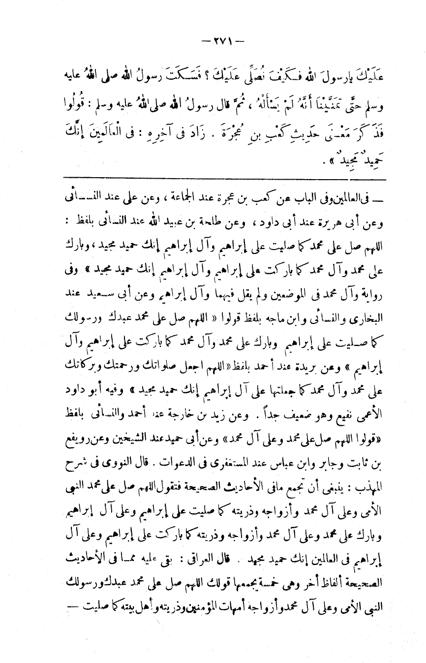 فِي الْعَالَمِينَ وَفِي الْبَاب عَنْ كَعْب بْن عُجْرَة عِنْد الْجَمَاعَة ، وَعَنْ عَلِيّ عِنْد النَّسَائِيِّ وَعَنْ أَبِي هُرَيْرَة عِنْد أَبِي دَاوُدَ ، وَعَنْ طَلْحَة بْن عُبَيْد اللَّه عِنْد النَّسَائِيِّ بِلَفْظِ : " اللَّهُمَّ صَلِّ عَلَى مُحَمَّد كَمَا صَلَّيْت عَلَى إِبْرَاهِيم إِنَّك حَمِيدٌ مَجِيدٌ ، وَبَارِكْ عَلَى مُحَمَّد وَآلِ مُحَمَّد كَمَا بَارَكْت عَلَى إِبْرَاهِيم وَآلِ إِبْرَاهِيم إِنَّك حَمِيد مَجِيد " وَفِي رِوَايَة وَآلِ مُحَمَّد فِي الْمَوْضِعَيْنِ وَلَمْ يَقُلْ فِيهِمَا وَآلِ إِبْرَاهِيم وَعَنْ أَبِي سَعِيد عِنْد الْبُخَارِيّ وَالنَّسَائِيِّ وَابْن مَاجَهْ بِلَفْظِ قُولُوا " اللَّهُمَّ صَلِّ عَلَى مُحَمَّد عَبْدك وَرَسُولك كَمَا صَلَّيْت عَلَى إِبْرَاهِيم وَبَارِكْ عَلَى مُحَمَّد وَآلِ مُحَمَّد كَمَا بَارَكْت عَلَى إِبْرَاهِيم وَآلِ إِبْرَاهِيم " وَعَنْ بُرَيْدَةَ عِنْد أَحْمَد بِلَفْظِ " اللَّهُمَّ اِجْعَلْ صَلَوَاتك وَرَحْمَتك وَبَرَكَاتك عَلَى مُحَمَّد وَآلِ مُحَمَّد كَمَا جَعَلْتهَا عَلَى آلِ إِبْرَاهِيم إِنَّك حَمِيد مَجِيد " وَفِيهِ أَبُو دَاوُدَ الْأَعْمَى نُفَيْع وَهُوَ ضَعِيف جِدًّا . وَعَنْ زَيْد بْن خَارِجَة عِنْد أَحْمَد وَالنَّسَائِيِّ بِلَفْظِ " قُولُوا اللَّهُمَّ صَلِّ عَلَى مُحَمَّد وَعَلَى آلِ مُحَمَّد " وَعَنْ أَبِي حُمَيْدٍ عِنْد الشَّيْخَيْنِ وَعَنْ رُوَيْفِع بْن ثَابِت وَجَابِر وَابْن عَبَّاس عِنْد الْمُسْتَغْفِرِيّ فِي الدَّعَوَات . قَالَ النَّوَوِيّ فِي شَرْح الْمُهَذَّب : يَنْبَغِي أَنْ تَجْمَع مَا فِي الْأَحَادِيث الصَّحِيحَة فَتَقُول اللَّهُمَّ صَلِّ عَلَى مُحَمَّد النَّبِيّ الْأُمِّيّ وَعَلَى آلِ مُحَمَّد وَأَزْوَاجه وَذُرِّيَّته كَمَا صَلَّيْت عَلَى إِبْرَاهِيم وَعَلَى آل إِبْرَاهِيم وَبَارِكْ عَلَى مُحَمَّد وَعَلَى آلِ مُحَمَّد وَأَزْوَاجه وَذُرِّيَّته كَمَا بَارَكْت عَلَى إِبْرَاهِيم وَعَلَى آلِ إِبْرَاهِيم فِي الْعَالَمِينَ إِنَّك حَمِيد مَجِيد . قَالَ الْعِرَاقِيّ : بَقِيَ عَلَيْهِ مِمَّا فِي الْأَحَادِيث الصَّحِيحَة أَلْفَاظ أُخَر وَهِيَ خَمْسَة يَجْمَعهَا قَوْلك اللَّهُمَّ صَلِّ عَلَى مُحَمَّد عَبْدك وَرَسُولك النَّبِيّ الْأُمِّيّ وَعَلَى آلِ مُحَمَّد وَأَزْوَاجه أُمَّهَات الْمُؤْمِنِينَ وَذُرِّيَّته وَأَهْل بَيْته كَمَا صَلَّيْت@