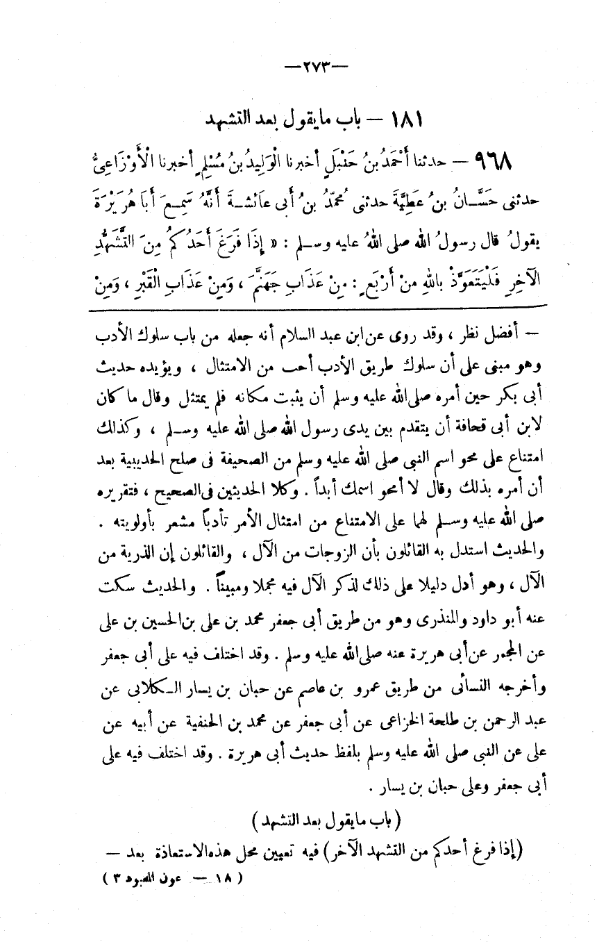 أفضل نظر، وقد روى عن ابن عبد السلام أنه جعله من باب سلوك الأدب وهو مبني على أن سلوك طريق الأدب أحب من الامتثال، ويؤيده حديث أبي بكر حين أمره صلى الله عليه وسلم أن يثبت مكانه فلم يمتثل وقال ما كان لابن أبي قحافة أن يتقدم بين يدي رسول الله صلى الله عليه وسلم، وكذلك امتناع على محو اسم النبي صلى الله عليه وسلم من الصحيفة في صلح الحديبية بعد أن أمره بذلك وقال لا أمحو اسمك أبداً. وكلا الحديثين في الصحيح، فتقريره صلى الله عليه وسلم لهما على الامتناع من امتثال الأمر تأدباً مشعر بأولويته. والحديث استدل به القائلون بأن الزوجات من الآل، والقائلون إن الذرية من الآل، وهو أدل دليلاً على ذلك لذكر الآل فيه مجملاً ومبيناً. والحديث سكت عنه أبو داوود والمنذري وهو من طريق أبي جعفر محمد بن علي بن الحسين بن علي عن المجمر عن أبي هريرة عنه صلى الله عليه وسلم. وقد اختلف فيه على أبي جعفر وأخرجه النسائي من طريق عمرو بن عاصم عن حبان بن يسار الكلابي عن عبد الرحمن بن طلحة الخزاعي عن أبي جعفر عن محمد بن الحنفية عن أبيه عن على عن النبي صلى الله عليه وسلم بلفظ حديث أبي هريرة. وقد اختلف فيه على أبي جعفر وعلي حبان بن يسار.