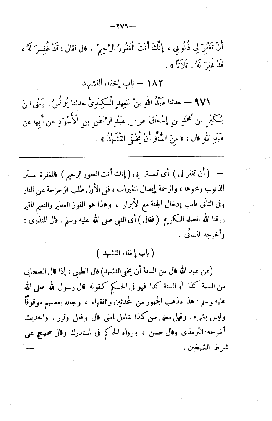 ( عَنْ عَبْد اللَّه قَالَ مِنْ السُّنَّة أَنْ يُخْفَى التَّشَهُّدُ )