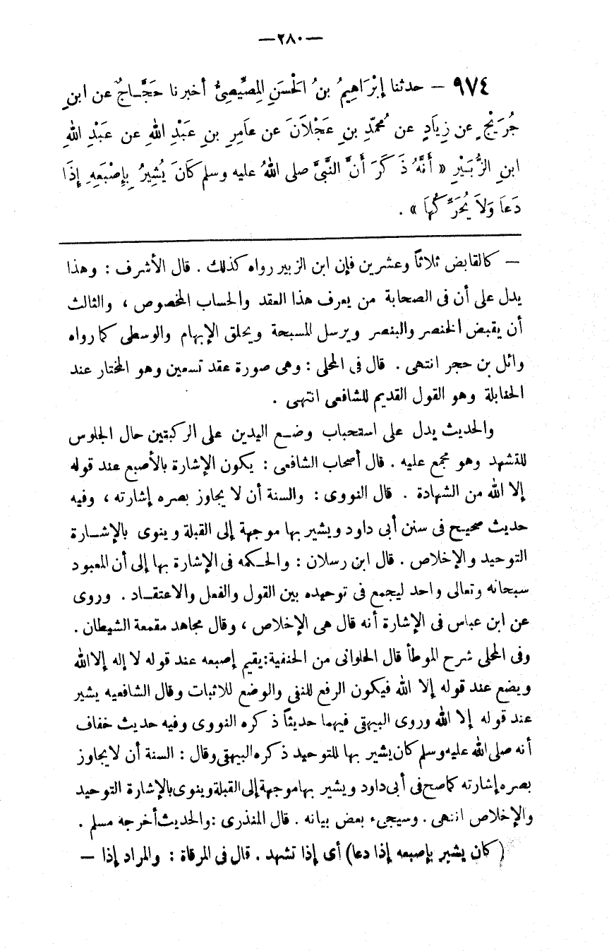 وَالْحَدِيث يَدُلّ عَلَى اِسْتِحْبَاب وَضْع الْيَدَيْنِ عَلَى الرُّكْبَتَيْنِ حَال الْجُلُوس لِلتَّشَهُّدِ وَهُوَ مُجْمَع عَلَيْهِ . قَالَ أَصْحَاب الشَّافِعِيّ : تَكُون الْإِشَارَة بِالْأُصْبُعِ عِنْد قَوْله إِلَّا اللَّه مِنْ الشَّهَادَة . قَالَ النَّوَوِيّ : وَالسُّنَّة أَنْ لَا يُجَاوِز بَصَرُهُ إِشَارَتَهُ ، وَفِيهِ حَدِيث صَحِيح فِي سُنَن أَبِي دَاوُدَ وَيُشِير بِهَا مُوَجَّهَة إِلَى الْقِبْلَة وَيَنْوِي بِالْإِشَارَةِ التَّوْحِيد وَالْإِخْلَاص . قَالَ اِبْن رَسْلَانِ : وَالْحِكْمَة فِي الْإِشَارَة بِهَا إِلَى أَنَّ الْمَعْبُود سُبْحَانه وَتَعَالَى وَاحِد لِيَجْمَع فِي تَوْحِيده بَيْن الْقَوْل وَالْفِعْل وَالِاعْتِقَاد . وَرُوِيَ عَنْ اِبْن عَبَّاس فِي الْإِشَارَة أَنَّهُ قَالَ هِيَ الْإِخْلَاص ، وَقَالَ مُجَاهِد مِقْمَعَة الشَّيْطَان . وَفِي الْمُحَلَّى شَرْح الْمُوَطَّأ قَالَ الْحَلْوَانِيّ مِنْ الْحَنَفِيَّة يُقِيم إِصْبَعه عِنْد قَوْله لَا إِلَه إِلَّا اللَّه وَيَضَع عِنْد قَوْله إِلَّا اللَّه فَيَكُون الرَّفْع لِلنَّفْيِ وَالْوَضْع لِلْإِثْبَاتِ وَقَالَ الشَّافِعِيَّة يُشِير عِنْد قَوْله إِلَّا اللَّه وَرَوَى الْبَيْهَقِيُّ فِيهِمَا حَدِيثًا ذَكَرَهُ النَّوَوِيّ وَفِيهِ حَدِيث خَفَّاف أَنَّهُ صَلَّى اللَّه عَلَيْهِ وَسَلَّمَ كَانَ يُشِير بِهَا لِلتَّوْحِيدِ ذَكَرَهُ الْبَيْهَقِيُّ وَقَالَ : السُّنَّة أَنْ لَا يُجَاوِزَ بَصَرُهُ إِشَارَتَهُ كَمَا صَحَّ فِي أَبِي دَاوُدَ وَيُشِير بِهَا مُوَجَّهَة إِلَى الْقِبْلَة وَيَنْوِي بِالْإِشَارَةِ التَّوْحِيد وَالْإِخْلَاص اِنْتَهَى . وَسَيَجِيءُ بَعْضُ بَيَانه .