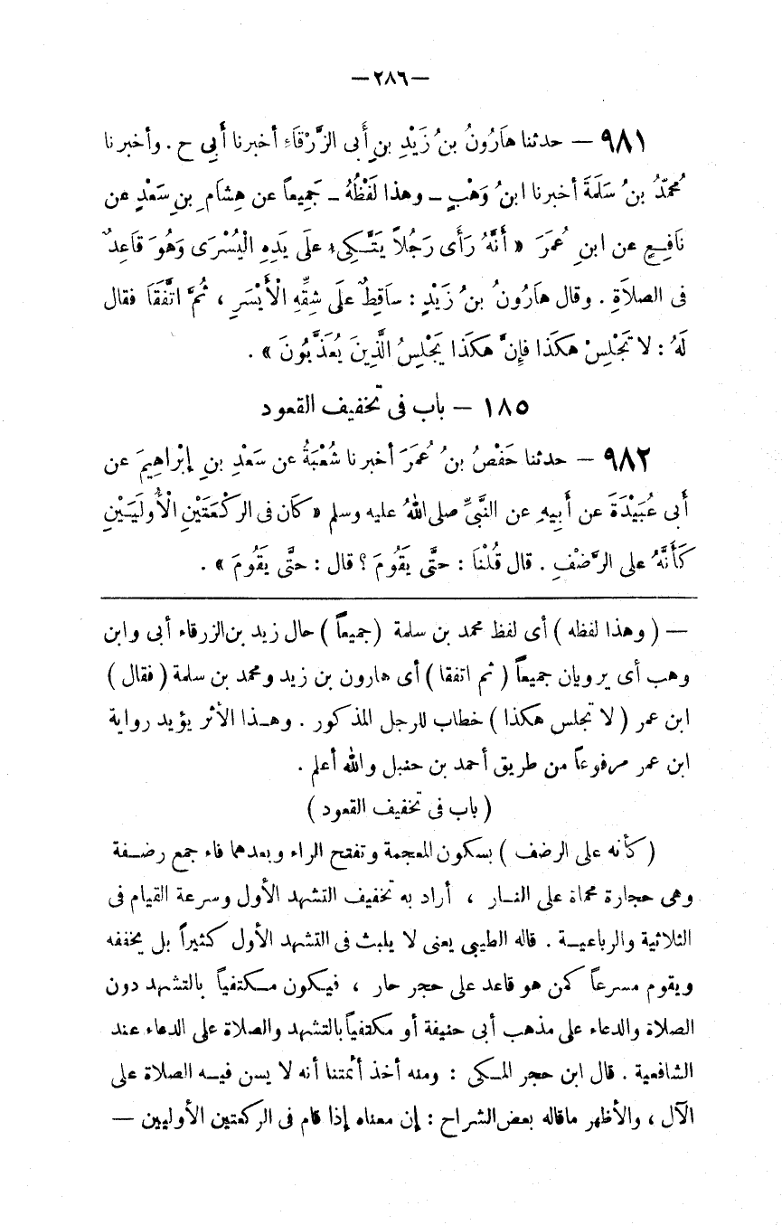 : بِسُكُونِ الْمُعْجَمَة وَتُفْتَح الرَّاء وَبَعْدهَا فَاء جَمْع رَضْفَة وَهِيَ حِجَارَة مُحْمَاة عَلَى النَّار ، أَرَادَ بِهِ تَخْفِيف التَّشَهُّد الْأَوَّل وَسُرْعَة الْقِيَام فِي الثُّلَاثِيَّة وَالرُّبَاعِيَّة . قَالَهُ الطِّيبِيُّ يَعْنِي لَا يَلْبَث فِي التَّشَهُّد الْأَوَّل كَثِيرًا بَلْ يُخَفِّفهُ وَيَقُوم مُسْرِعًا كَمَنْ هُوَ قَاعِد عَلَى حَجَر حَارّ ، فَيَكُون مُكْتَفِيًا بِالتَّشَهُّدِ دُون الصَّلَاة وَالدُّعَاء عَلَى مَذْهَب أَبِي حَنِيفَة أَوْ مُكْتَفِيًا بِالتَّشَهُّدِ وَالصَّلَاة عَلَى الدُّعَاء عِنْد الشَّافِعِيَّة . قَالَ اِبْن حَجَر الْمَكِّيّ : وَمِنْهُ أَخَذَ أَئِمَّتنَا أَنَّهُ لَا يُسَنّ فِيهِ الصَّلَاة عَلَى الْآلِ ، وَالْأَظْهَر مَا قَالَهُ بَعْض الشُّرَّاح : إِنَّ مَعْنَاهُ إِذَا قَامَ فِي الرَّكْعَتَيْنِ الْأُولَيَيْنِ@