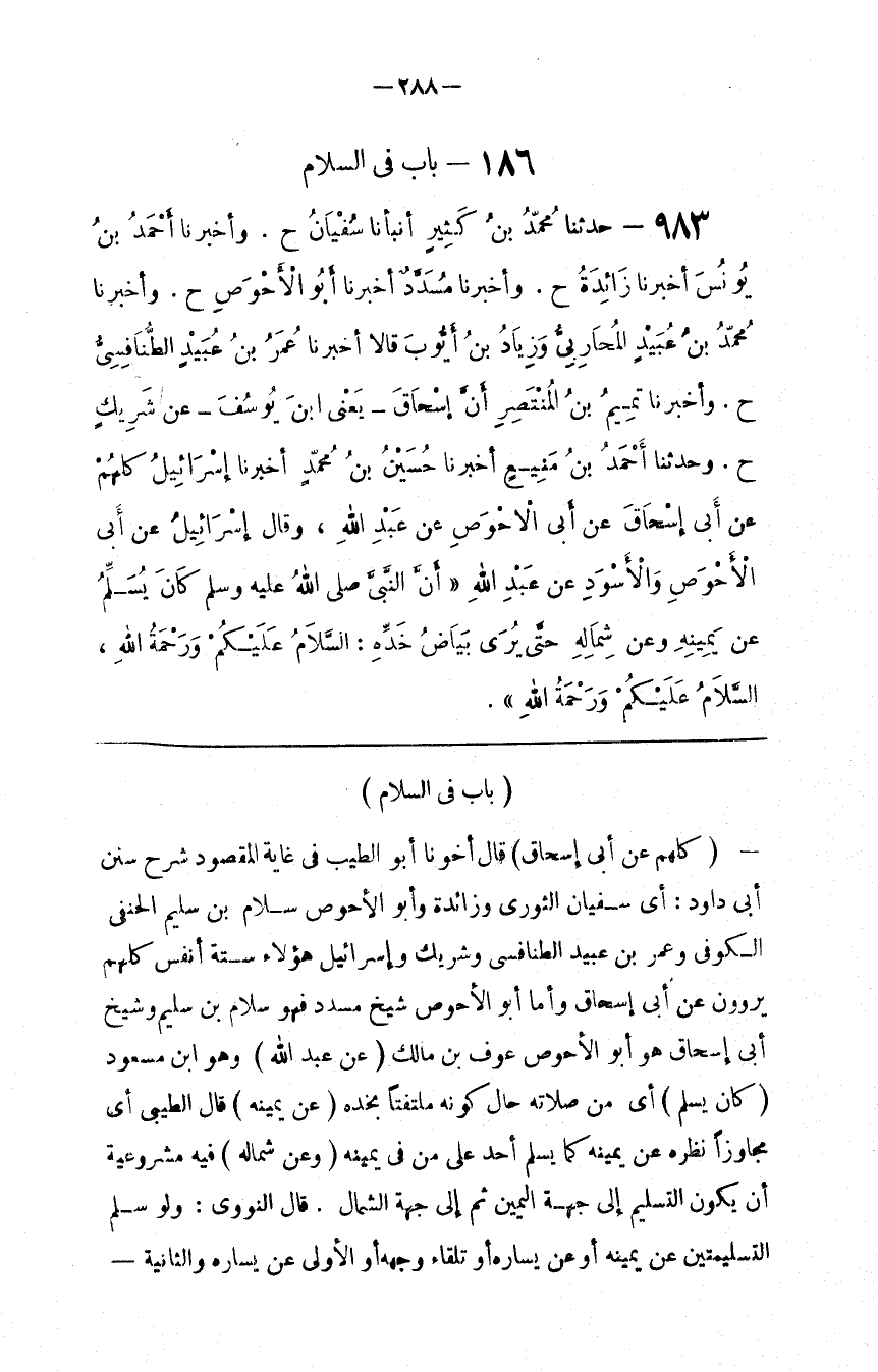 . فِيهِ مَشْرُوعِيَّة أَنْ يَكُون التَّسْلِيم إِلَى جِهَة الْيَمِين ثُمَّ إِلَى جِهَة الشِّمَال . قَالَ النَّوَوِيُّ : وَلَوْ سَلَّمَ التَّسْلِيمَتَيْنِ عَنْ يَمِينه أَوْ عَنْ يَسَاره أَوْ تِلْقَاء وَجْهه أَوْ الْأُولَى عَنْ يَسَاره وَالثَّانِيَة @