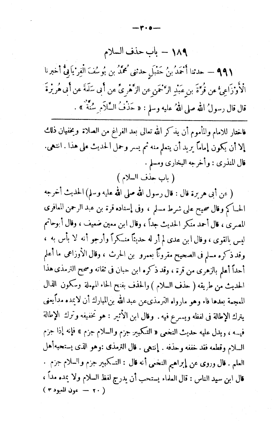 . وَالْحَذْف بِفَتْحِ الْحَاء الْمُهْمَلَة وَسُكُون الذَّال الْمُعْجَمَة بَعْدهَا فَاء وَهُوَ مَا رَوَاهُ التِّرْمِذِيّ عَنْ عَبْد اللَّه بْن الْمُبَارَك أَنْ لَا يَمُدّهُ مَدًّا يَعْنِي يَتْرُك الْإِطَالَة فِي لَفْظه وَيُسْرِع فِيهِ . وَقَالَ اِبْن الْأَثِير : هُوَ تَخْفِيفه وَتَرْك الْإِطَالَة فِيهِ ، وَيَدُلّ عَلَيْهِ حَدِيث النَّخَعِيِّ " التَّكْبِير جَزْم وَالسَّلَامُ جَزْم " فَإِنَّهُ إِذَا جَزَمَ السَّلَام وَقَطَعَهُ فَقَدْ خَفَّفَهُ وَحَذَفَهُ . اِنْتَهَى . قَالَ التِّرْمِذِيّ : وَهُوَ الَّذِي يَسْتَحِبُّهُ أَهْل الْعِلْم . قَالَ وَرُوِيَ عَنْ إِبْرَاهِيم النَّخَعِيِّ قَالَ : التَّكْبِير جَزْم وَالسَّلَام جَزْم . قَالَ اِبْن سَيِّد النَّاس : قَالَ الْعُلَمَاء يُسْتَحَبّ أَنْ يُدْرِج لَفْظ السَّلَام وَلَا يَمُدّهُ مَدًّا @